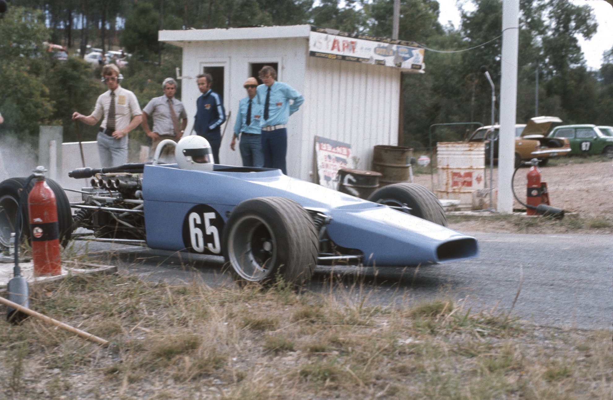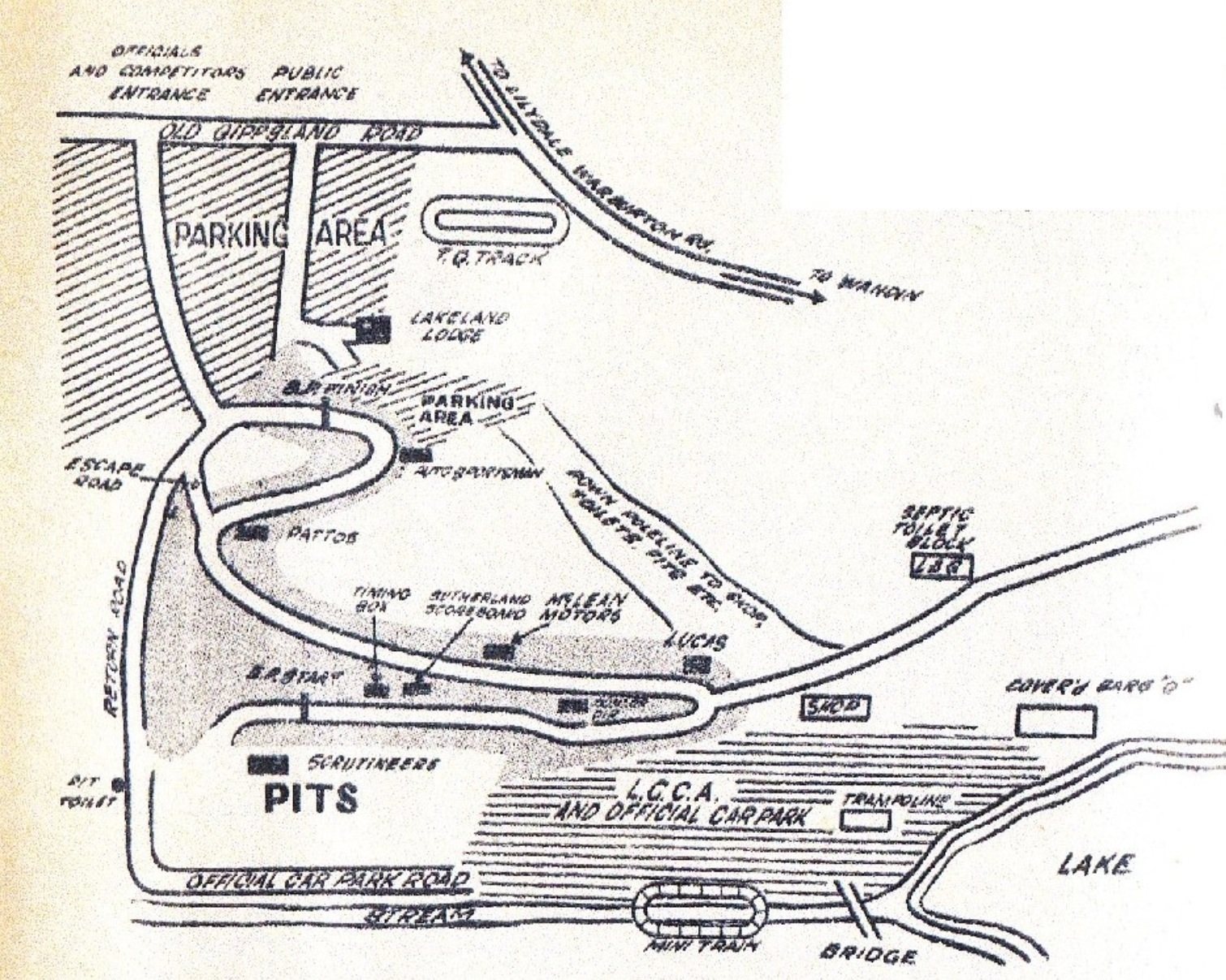The start/finish area is located on Berry’s Beach Road, the pits used to be located in a large paddock, which today is still a large paddock.