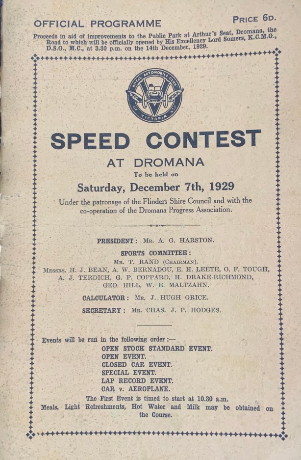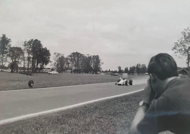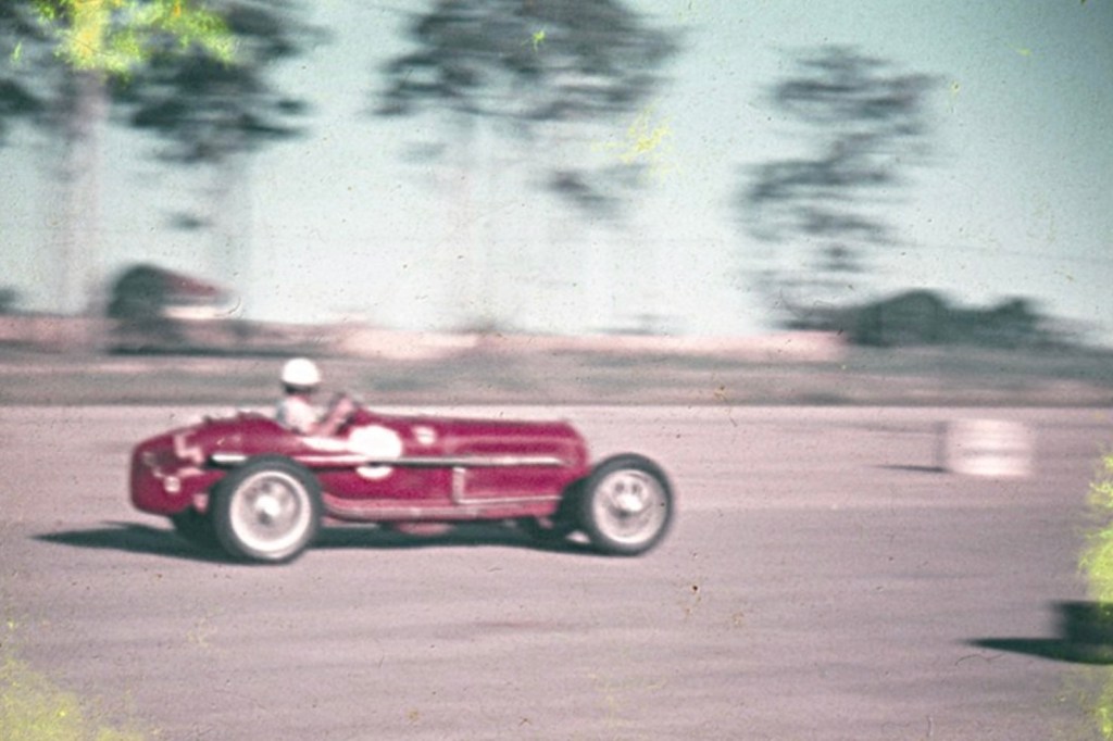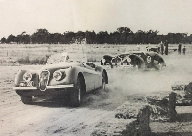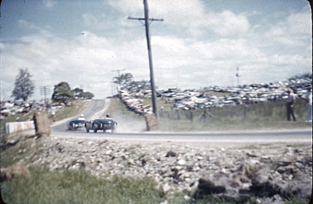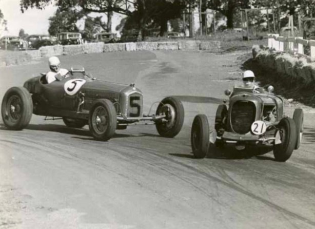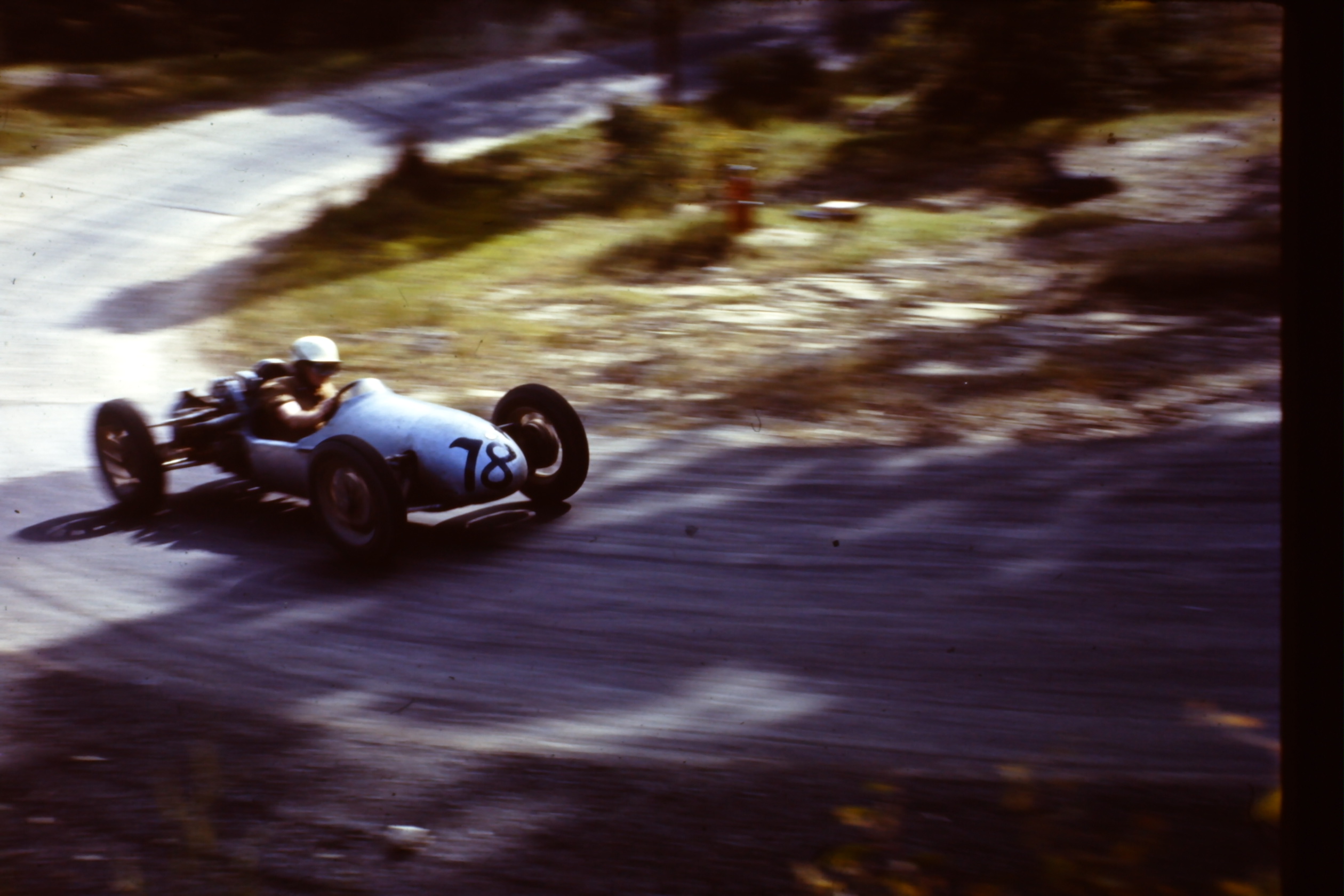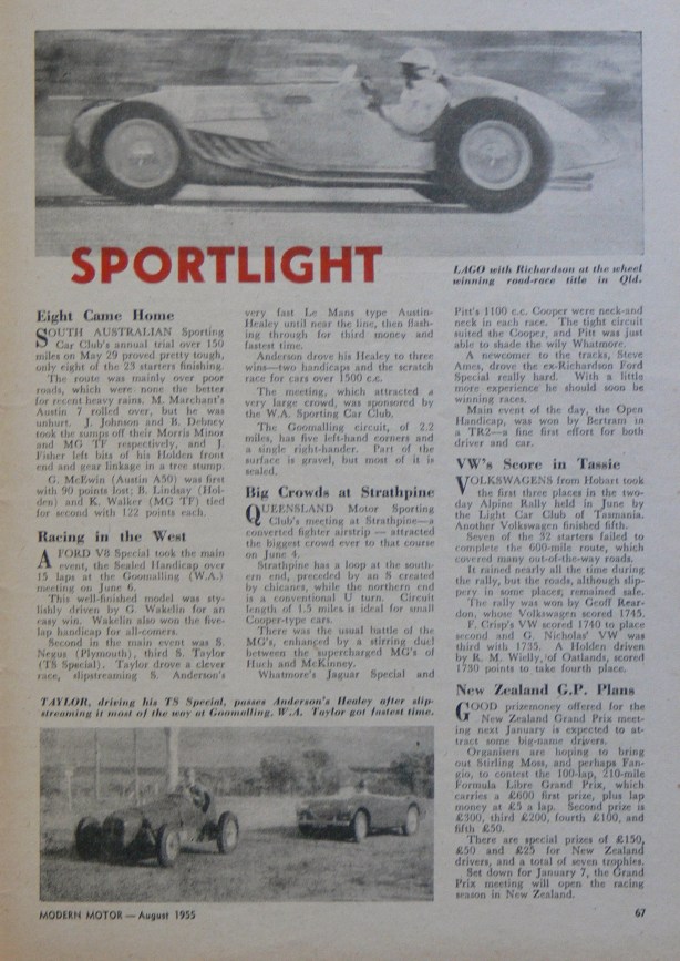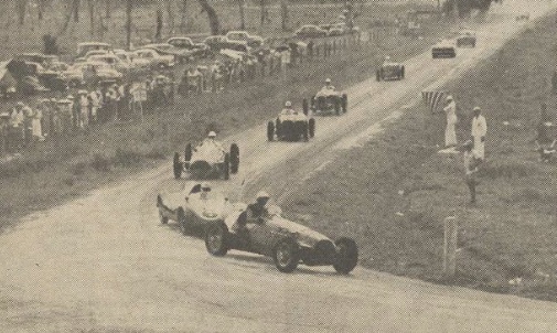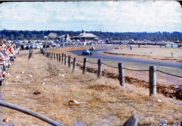The ‘Wheels’ magazine report of the meeting mentions George Pearse crashing his Cooper-MG in a 25 mile race for racing cars and stripped sportscars whilst passing Alec Mildren’s Cooper Bristol on the narrow pit straight at over 100mph, he put two wheels onto the grass. Brabham won that encounter from Davison and Mildren. Rex Taylor’s Jag XK120 won the sportscar race and Jack Myers Holden the production car race.