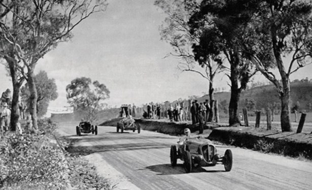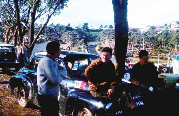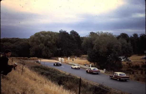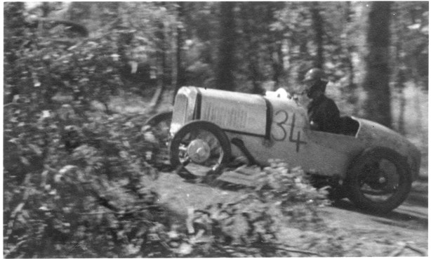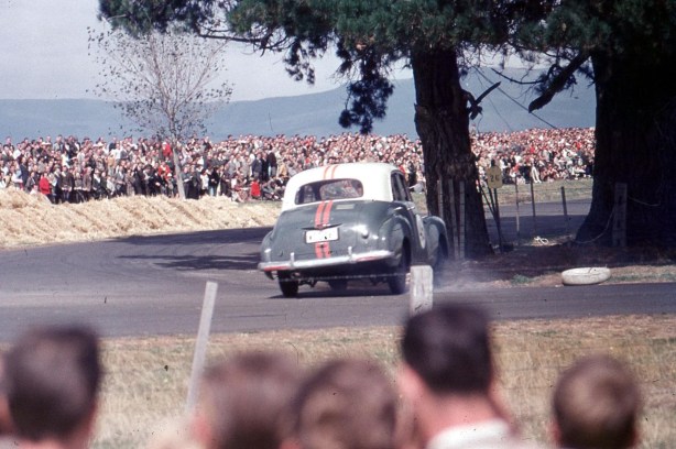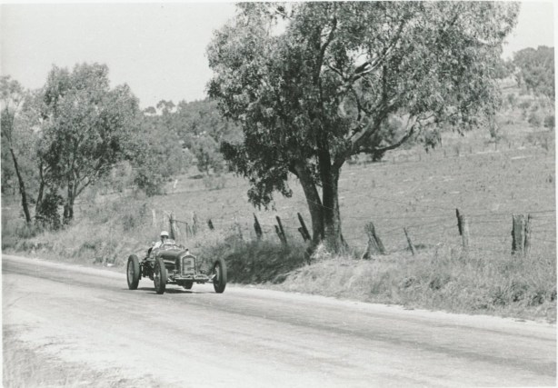 The shot below is of Davo in the same car on Mount Panorama during Easter 1951- down Conrod at a fair old clip between the trees, posts barbed wire and cattle on a rather narrow strip of bumpy bitumen.