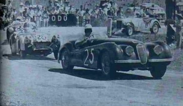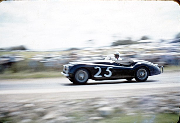 Rex Taylor, Jaguar XK120 from the Barry Griffiths and Bertram Triumph TR2s and the Stan Mossetter (I think) MG TC – a battle during the championship race above, and a superb portrait hunched over the wheel below- Paul Cummins advises the chassis number as #660226.