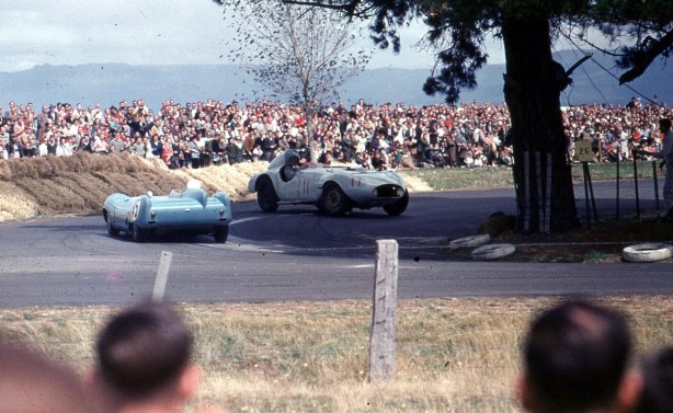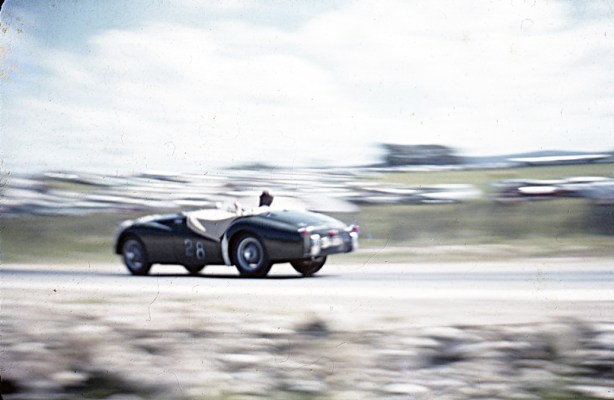Stunning shot of Rex Taylor’s Jaguar XK120 ahead of Barry Griffiths Triumph TR2 on the dangerous swoops of Southport. The typical perils of road racing tracks of the day are readily apparent.