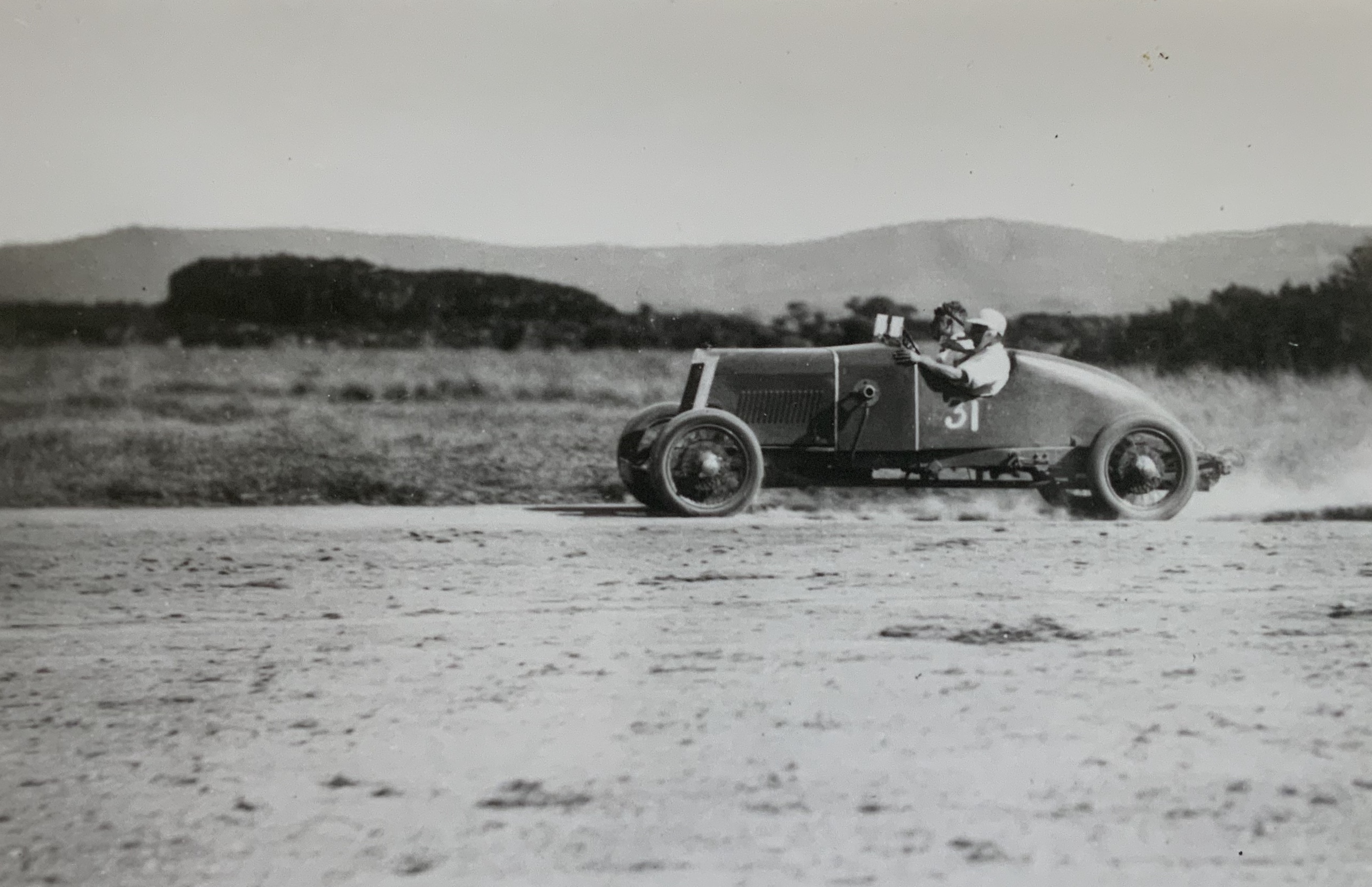 The shot below is of Davo in the same car on Mount Panorama during Easter 1951- down Conrod at a fair old clip between the trees, posts barbed wire and cattle on a rather narrow strip of bumpy bitumen.