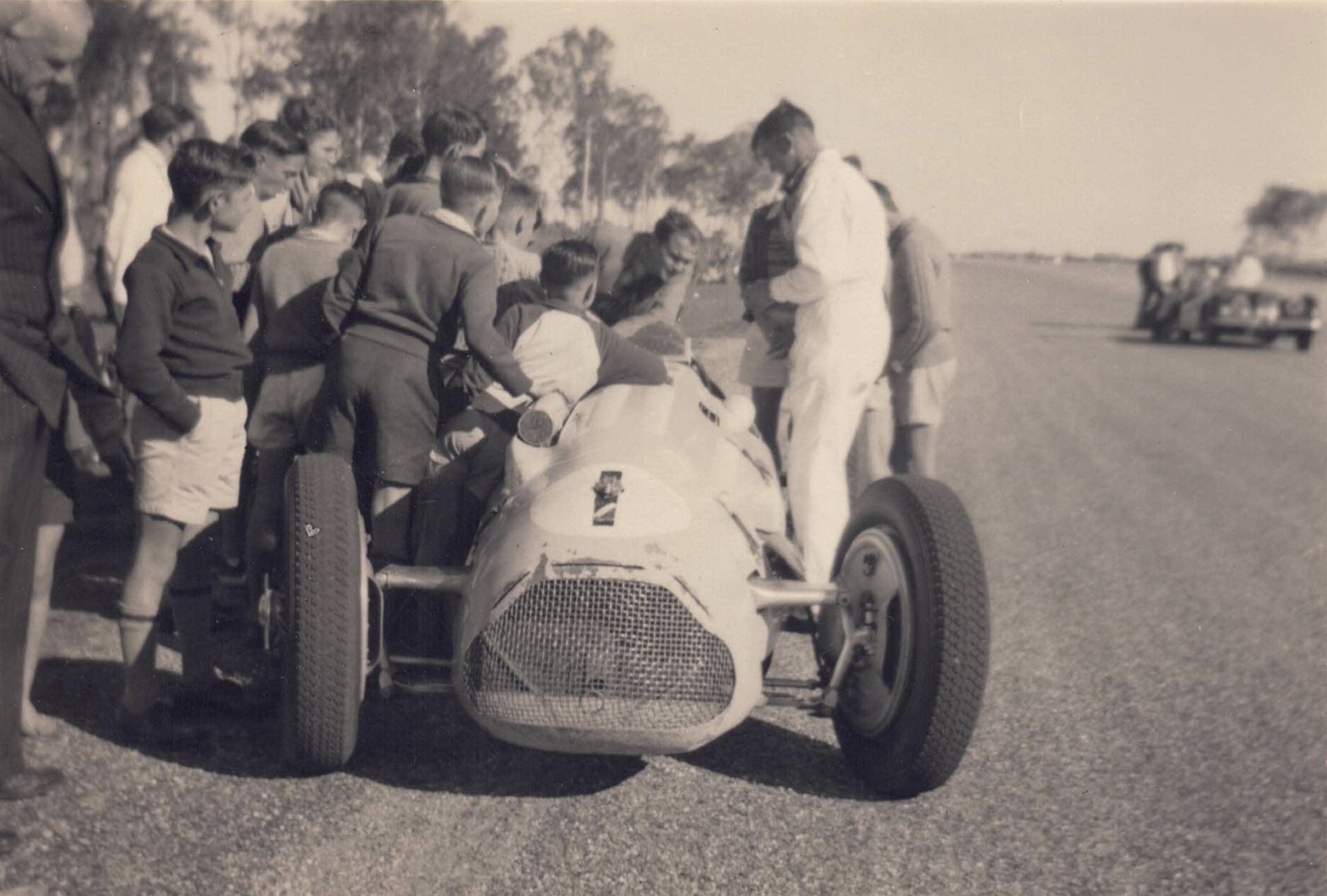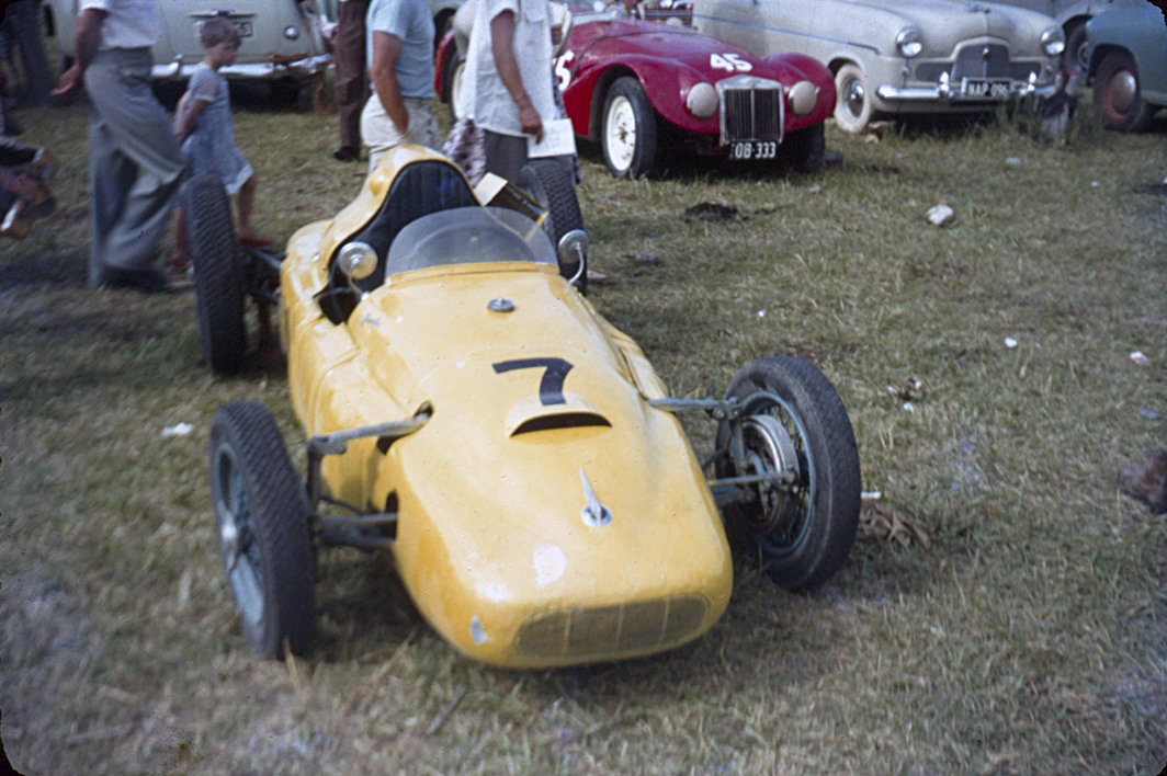 The ‘Wheels’ magazine report of the meeting mentions George Pearse crashing his Cooper-MG in a 25 mile race for racing cars and stripped sportscars whilst passing Alec Mildren’s Cooper Bristol on the narrow pit straight at over 100mph, he put two wheels onto the grass. Brabham won that encounter from Davison and Mildren. Rex Taylor’s Jag XK120 won the sportscar race and Jack Myers Holden the production car race.