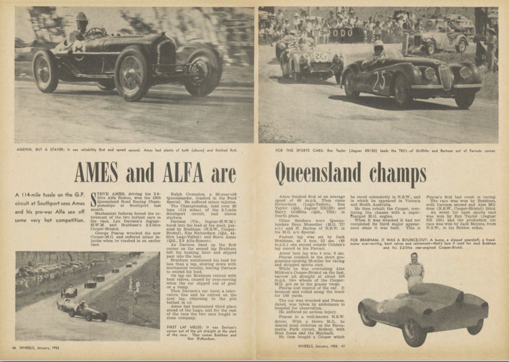 Despite its age, the Grand Prix Alfa was a fast, formidable bit of kit the youngster seems to have driven very well although he sold it without too many recorded events to Rex Taylor. Whilst some reports have it he moved to the UK in 1956, Ouvaroff raced the Healey 100S in a hillclimb at Burleigh Heads on the Gold Coast, that December.