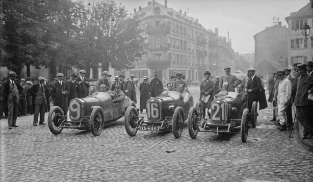 The Sunbeam team cars lined up at Strasbourg before the start of the 1922 French GP- #9 Jean Chassagne, #16 Kenelm Lee Guinness and #21 Henry Segrave (Selou)