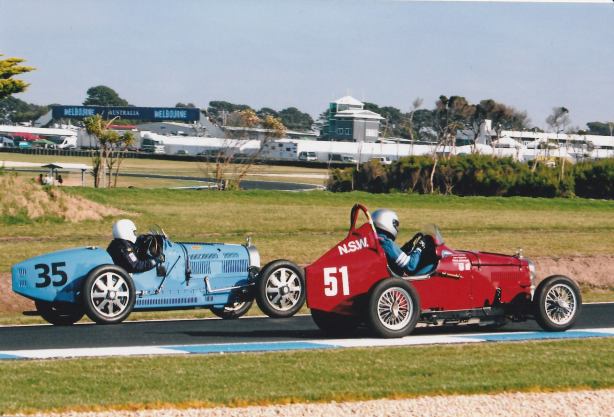 Mal Reid in the Sulman Singer passes George Hetrel’s Bugatti Type 35C at Phillip Island (FB)