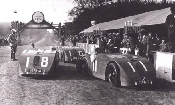 Arthur Duray in the 4.44 litre straight-4 Delage Type S before the off. #9 is Paul Bablot (unattributed)