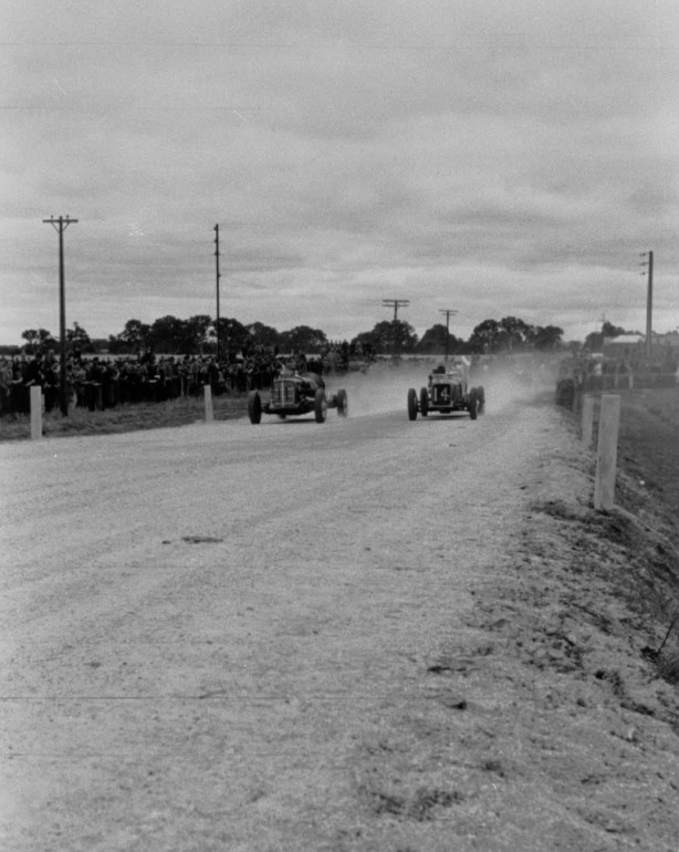Mal Reid in the Sulman Singer passes George Hetrel’s Bugatti Type 35C at Phillip Island (FB)