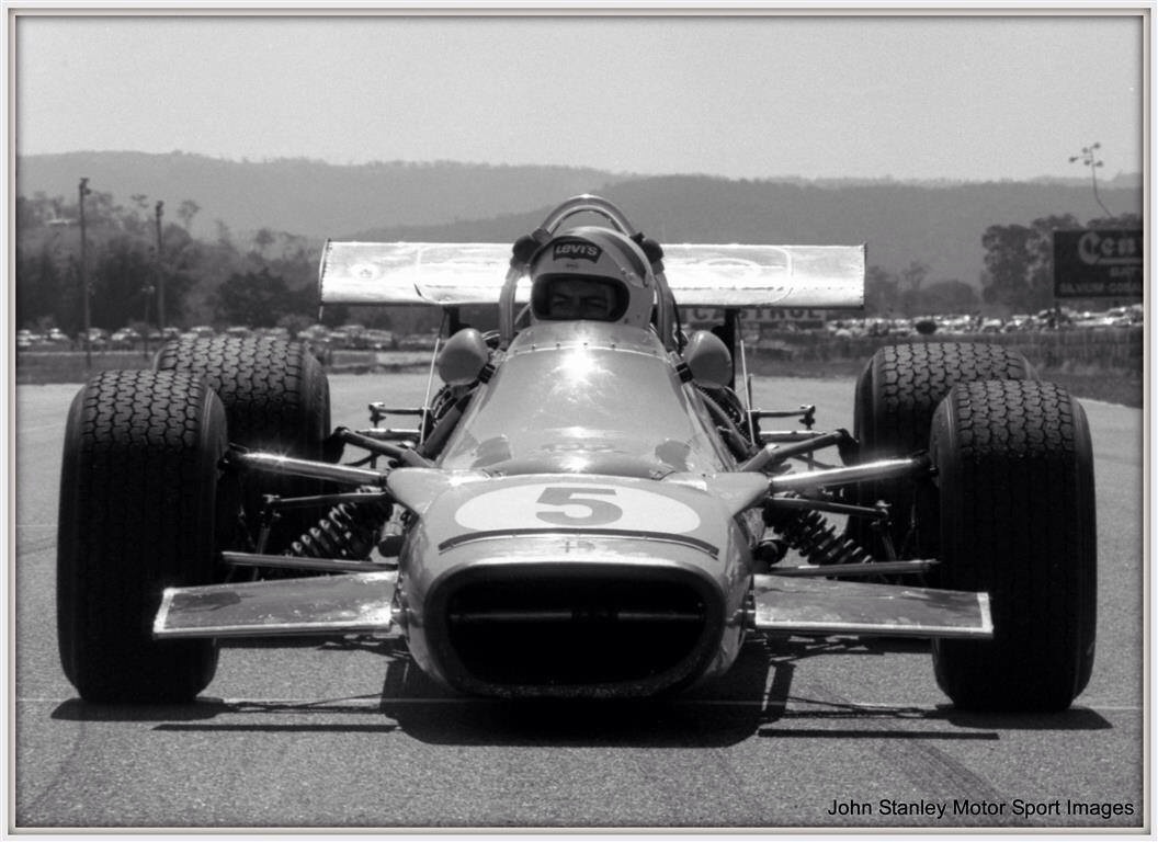 John Harvey on the hop in Bob Jane’s Brabham BT23E Repco 830 V8, he was out with cam-follower failure after completing 38 laps.
