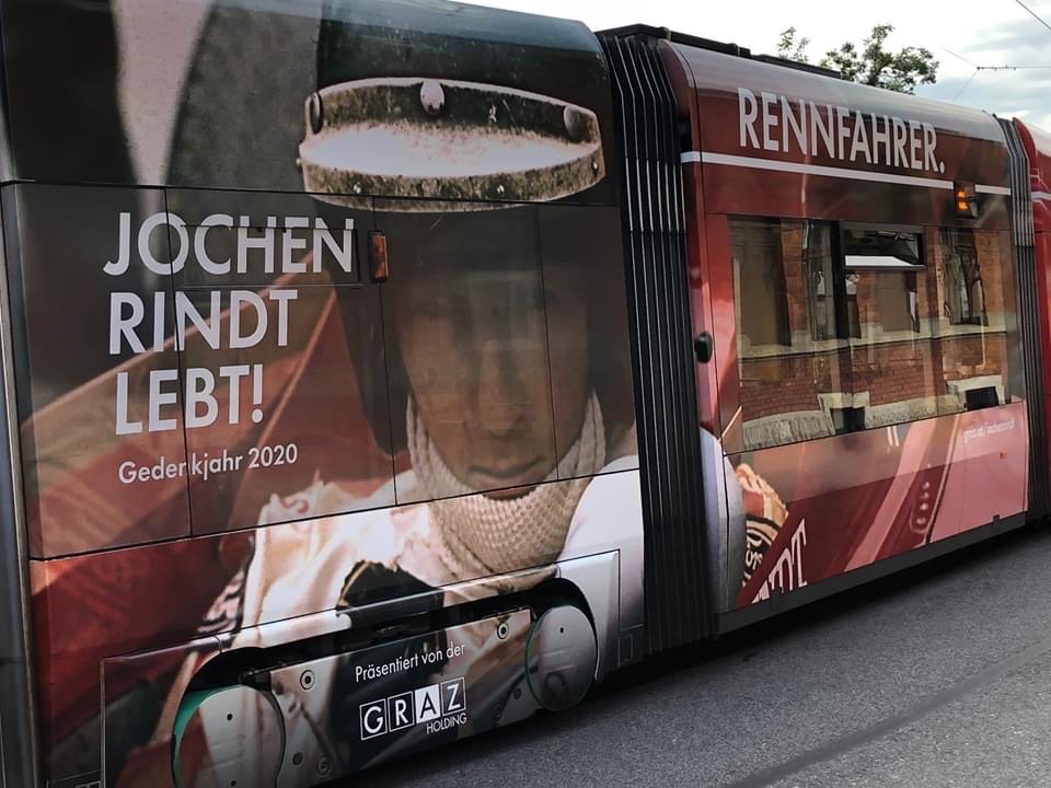 One of Graz’ favourite sons- the place in which Rindt was brought up and called home is being celebrated on the city trams at present.