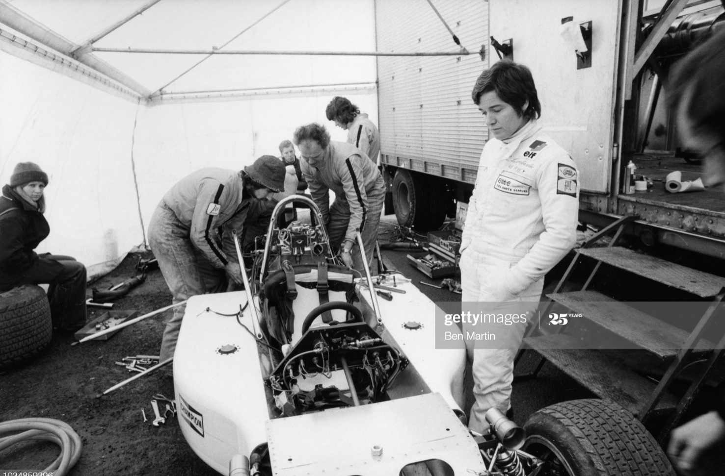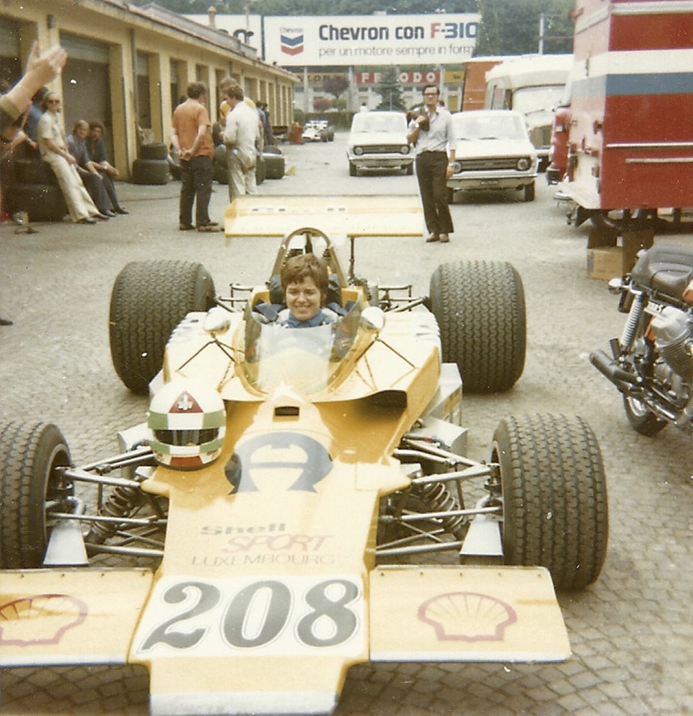 At home during the European F5000 Championship in 1974, the Monza paddock on 30 June. Familiarity with the circuit showed too, she qualified sixth and finished fourth behind Gethin, Pilette and Evans.