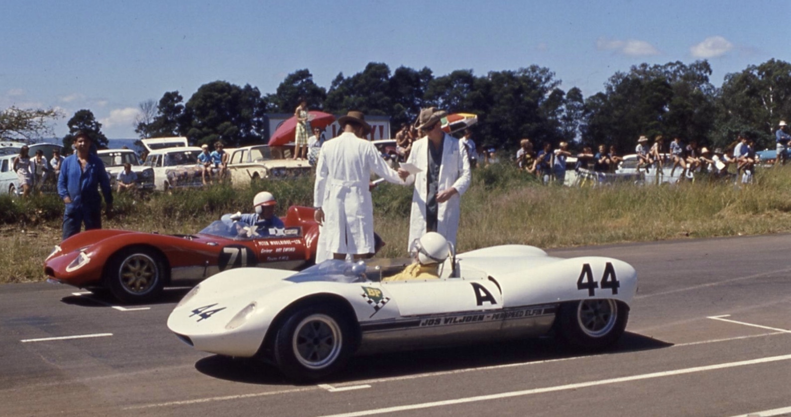 Jos Viljoen’s Elfin Mallala Ford alongside Ray Emond’s Lola Mk1 Ford on the Roy Hesketh grid during the Easter 1967 long weekend.