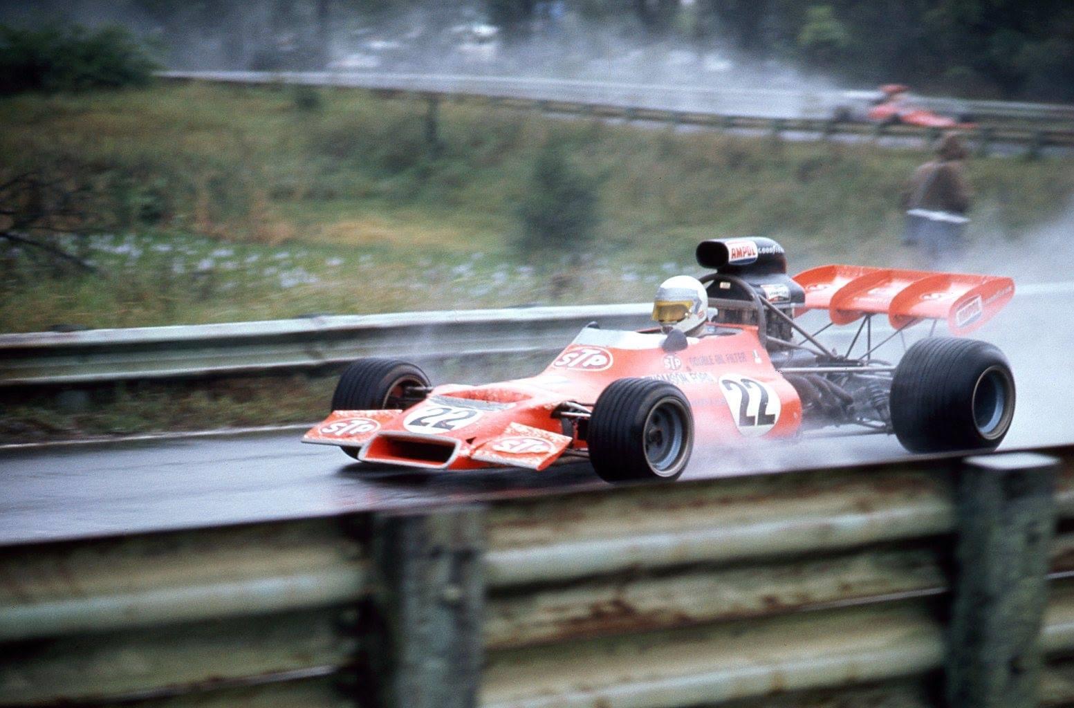 Graham McRae on a day for the ducks- the Warwick Farm 100 Tasman round in 1973.