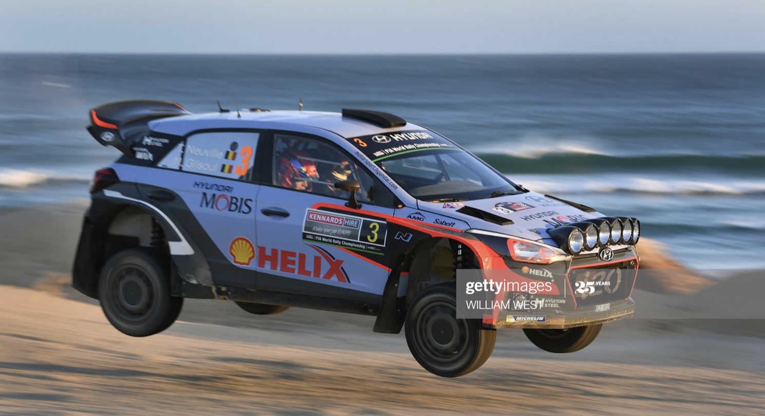 Aerobatics of the Thierry Neuville/Nicolas Gilsoul Hyundai i20 WRC on the first day of the event at Coffs Harbour, New South Wales on 18 November.