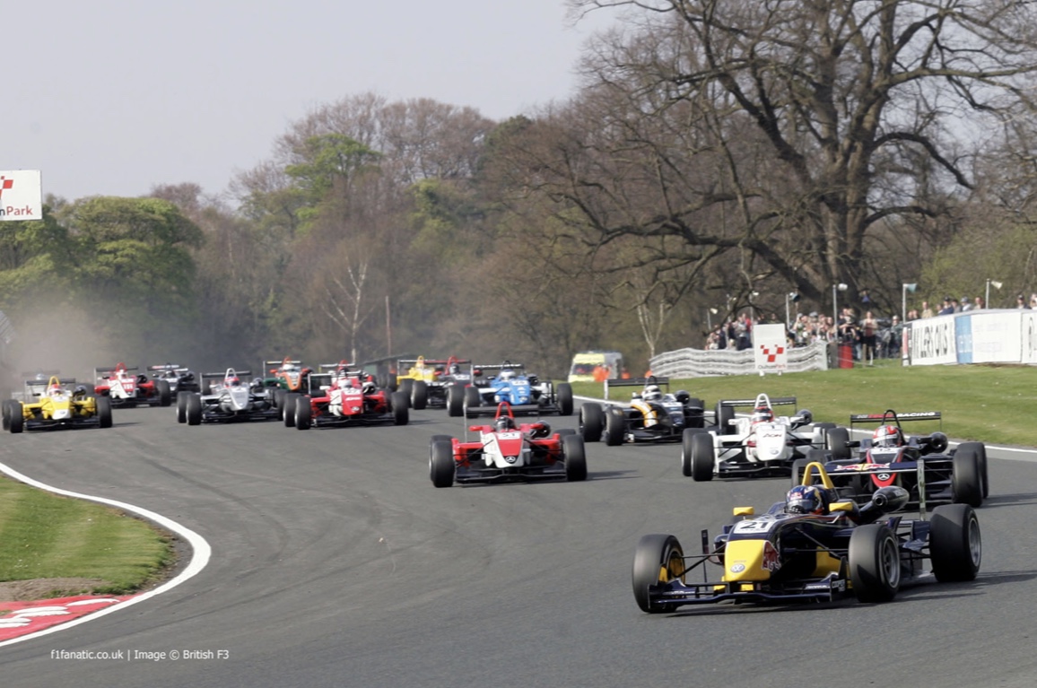 Daniel Ricciardo leads the chasing Oulton Park F3 pack in 2009.