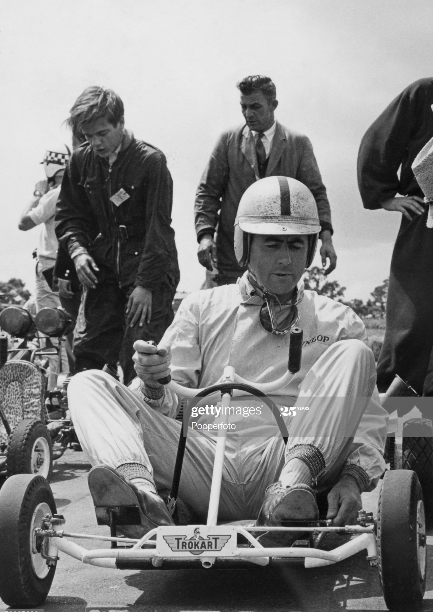 Jack Brabham ponders the Trokart allocated him for some type of curtain/fund raiser- Innes Ireland by the look at that helmet is behind him which promises mayhem at the first corner!
