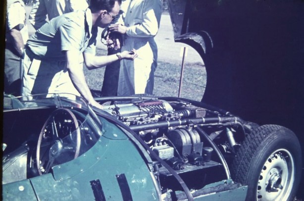 Jack’s T23 being tended by Keith Holland in the white overalls and Arthur Gray of Belshaw Foundry in the blazer (Brabham Family)