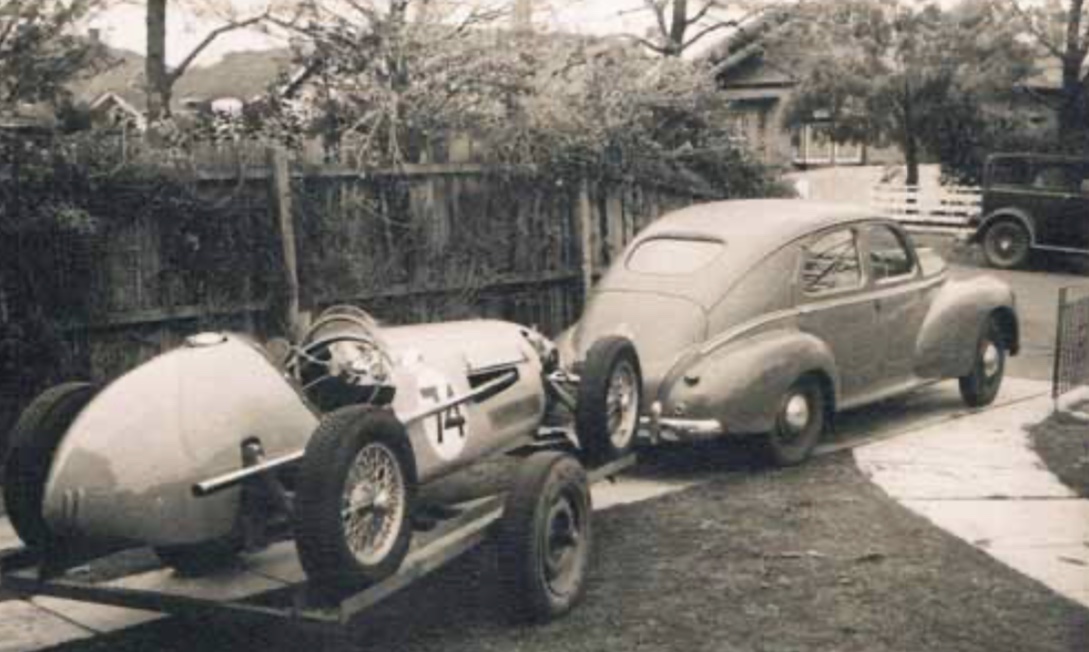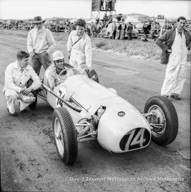 After testing in the quiet(!) of the Geelong Road Ian ran the machine at the Beveridge and Templestowe Hillclimbs in chassis form, and then at Fisherman’s Bend with its body fitted. He finished two races despite fuel feed problems caused by shortcomings in the manifold design.