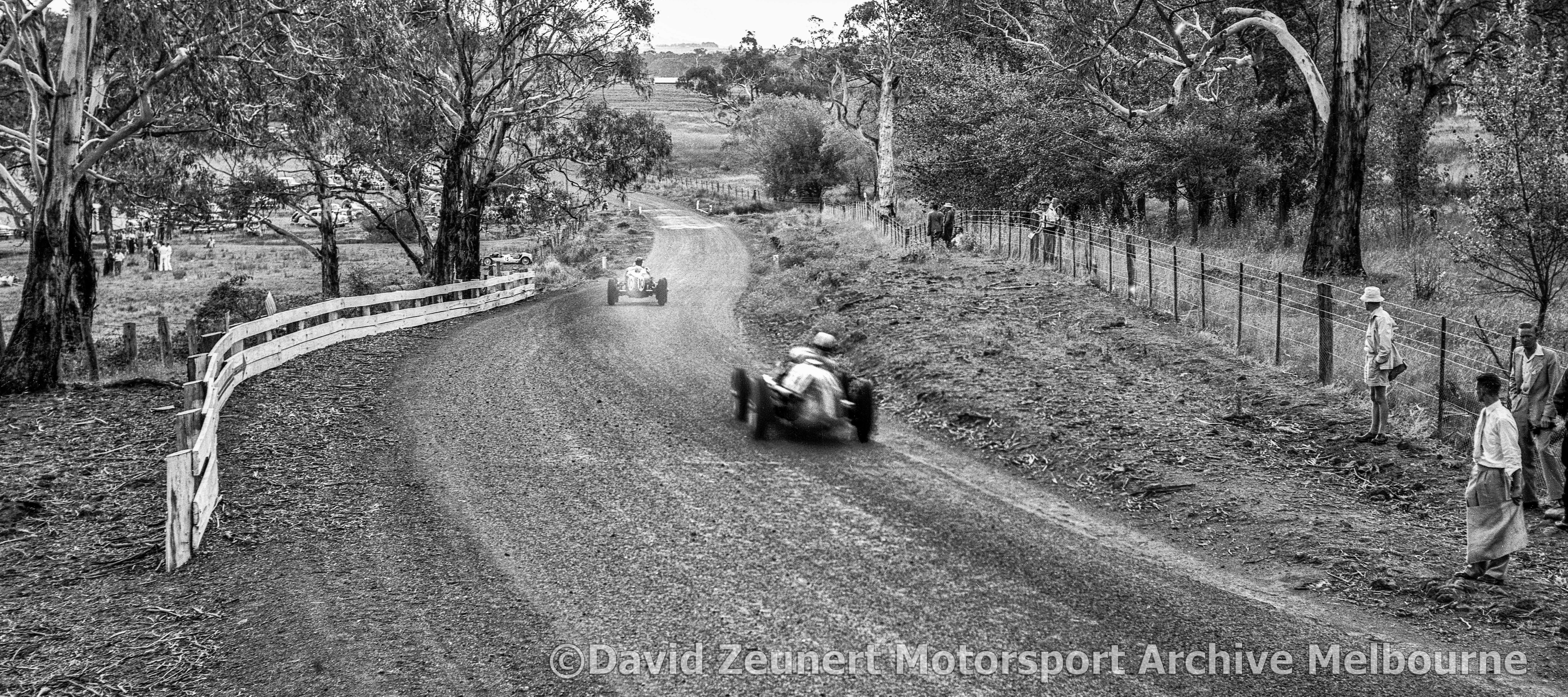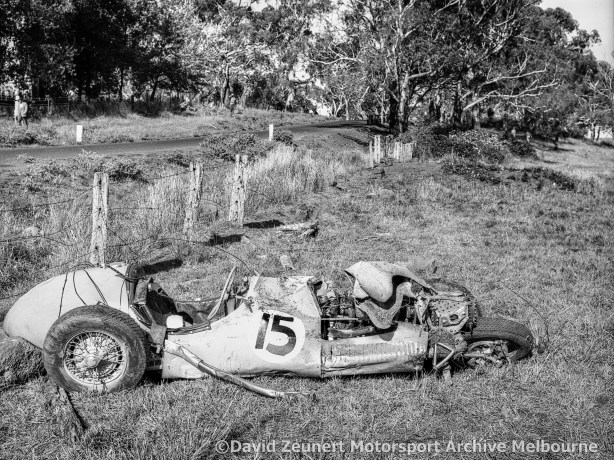 Two cars in Connaghan’s Corner after the right-hand Mrs Mutton’s Corner and then the downhill The Dip. Ian has lost adhesion and left the circuit on the outside, his crashed car is visible with officials well away on the left as, perhaps, the South Pacific Trophy takes place. Superb, rare angle of this section of this road circuit whilst noting the sad scene Reg Hunt reveals