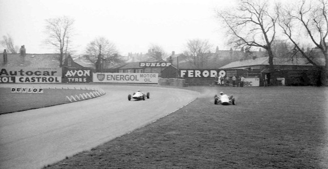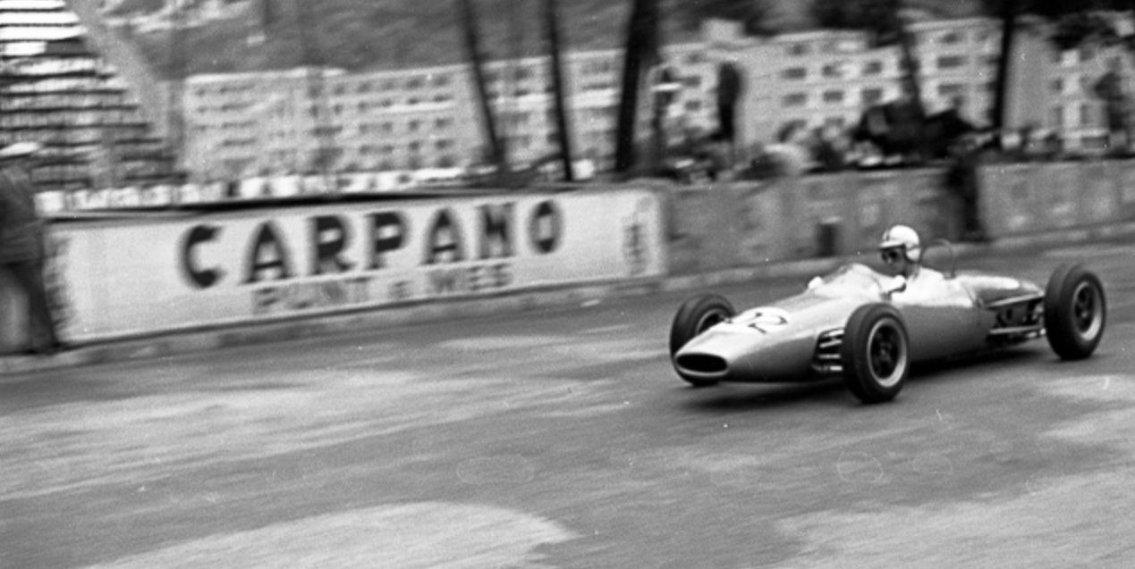 Jackie Stewart’s 2.1-litre BRM P261 V8 from Jim Clark, 2-litre Lotus 33 Coventry Climax FWMV V8, look closely and Jackie’s lightly-loaded right-front is just ‘orf terra-firma.