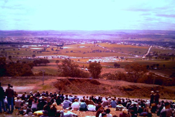 Mount Panorama view across The Cutting from Sulman Park with Bathurst in the distance, circa 1960.