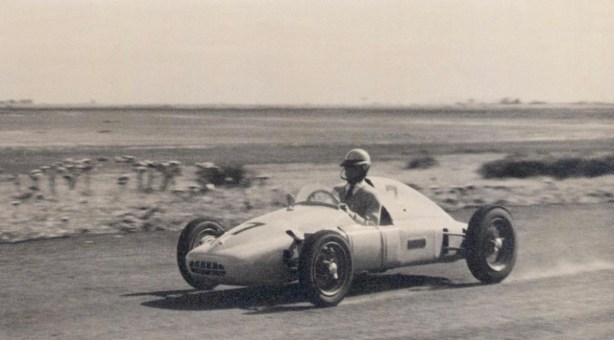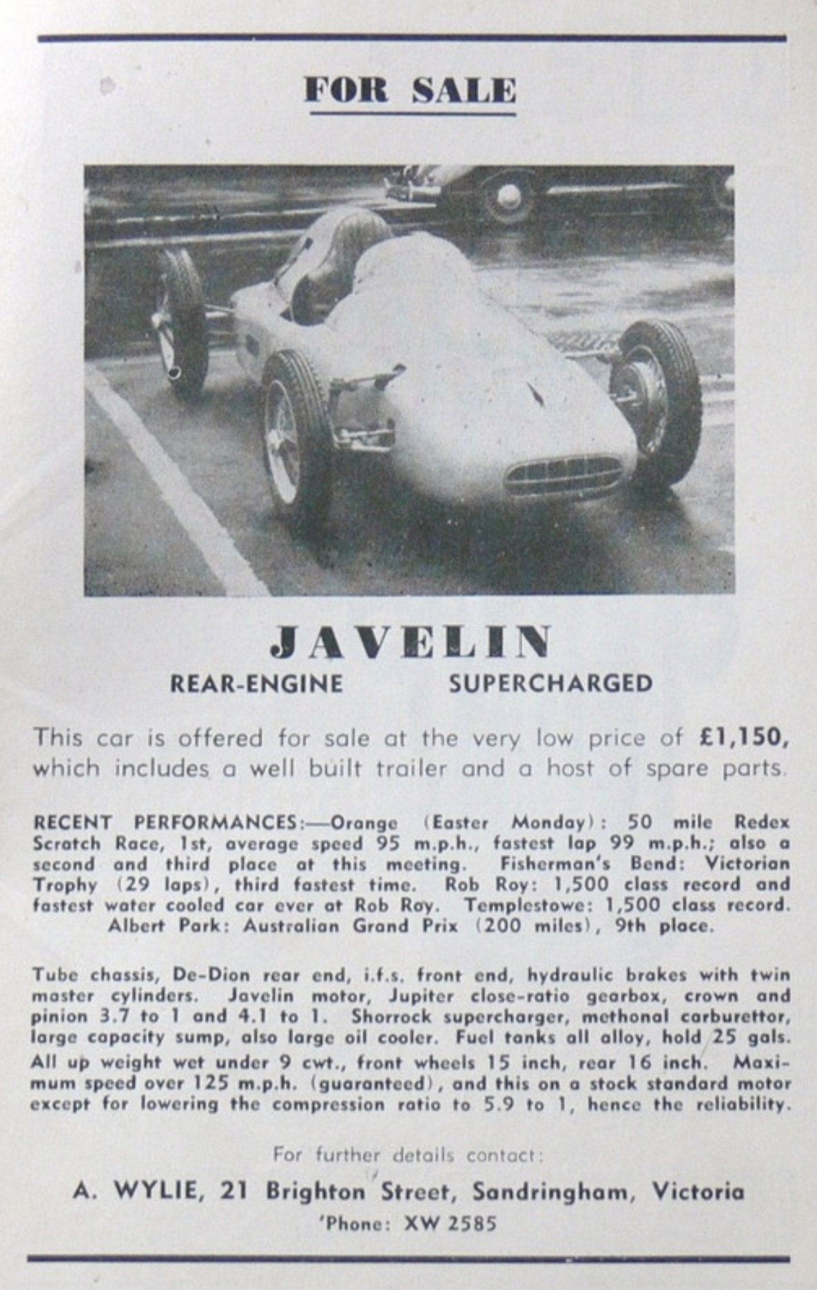 Arthur Wylie, looking very smart in shirt and tie racing the wonderful Wylie Javelin on the short-lived Altona track in Melbourne’s inner-west in March 1954.