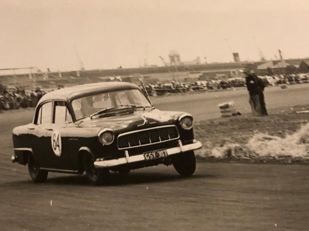 Mick Watt competing in the first ‘Half-Hour’ race at QH in 1953 in Ford Anglia. This little car, nicknamed the ‘Magic Goat’ won 64 races.