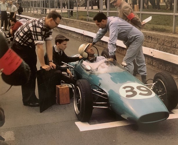 Jackie Stewart, Bob Jane, Tim Parnell, a BRM mechanic and P261 ‘2614’ await the start of the South Pacific Championship on March 1967.
