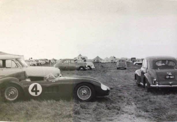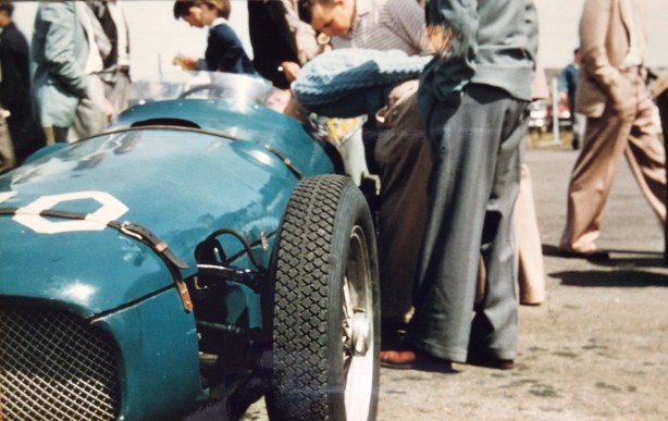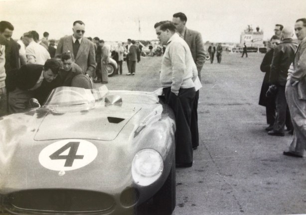 Poor Arnold Glass is stuck in the intake of his glorious ex-works-Reg Parnell Ferrari 555 Super Squalo ‘555-2’ during the ’58 Gold Star weekend. ‘It’s arrived not long ago from New Zealand, still has the NZ rego #495795 on the nose’ said Dalton.
