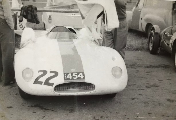 He entered the Cooper in the Bathurst Easter meeting where the 1.7-litre FPF engined car (presumably Jack took the 2.2 back to England) was very fast. In a 3 lap preliminary Bib started from pole but his new Cooper jumped out of gear. He quickly plucked it and set off amongst the mid-field bunch but touched wheels with Alec Mildren’s similar car (our opening shot machine) in the first turn- Hell Corner. The car somersaulted several times before landing back on its wheels. Bib was ok with facial cuts and abrasions but the Cooper was a tad worse for wear. After repair it was sold to Bill Patterson who raced it for the first time at Lowood in August.