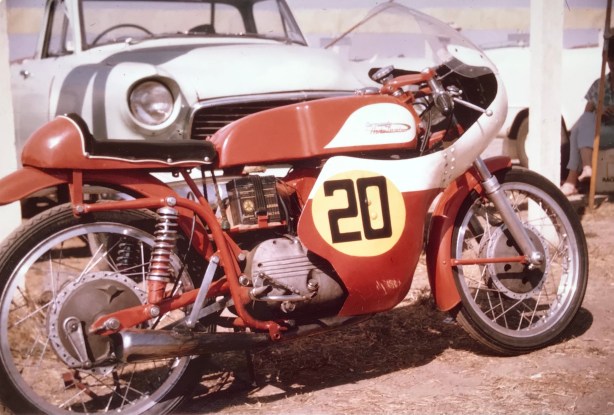He progressed through an Aermacchi Ala d’Oro 250 pushrod single as below. ‘Built 1963 or 1964, I bought it second hand from the distributor. It was a toss-up between this and a Yamaha TD1-A and I went with this. Great handling and brakes but in my ownership it was lacking in reliability, which in hindsight was a combination of me and the bike.’