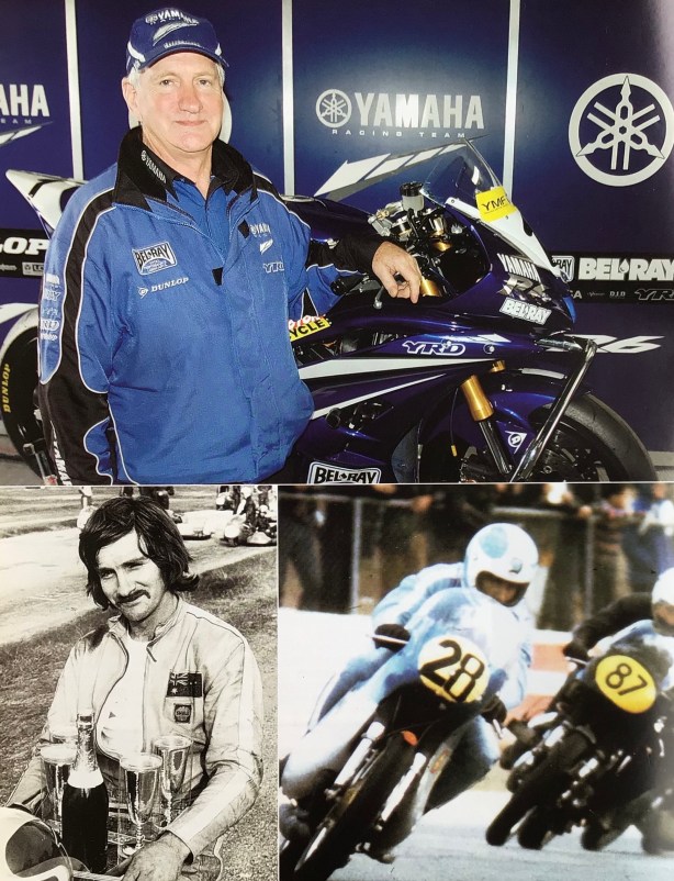 Peter with a modern Yamaha, above leading Eric Debenham and Eric Hindle at Oran Park on the TR500 in 1970. With ‘mo’ after a win on the TR500 in 1970 (Old Bike Australasia)