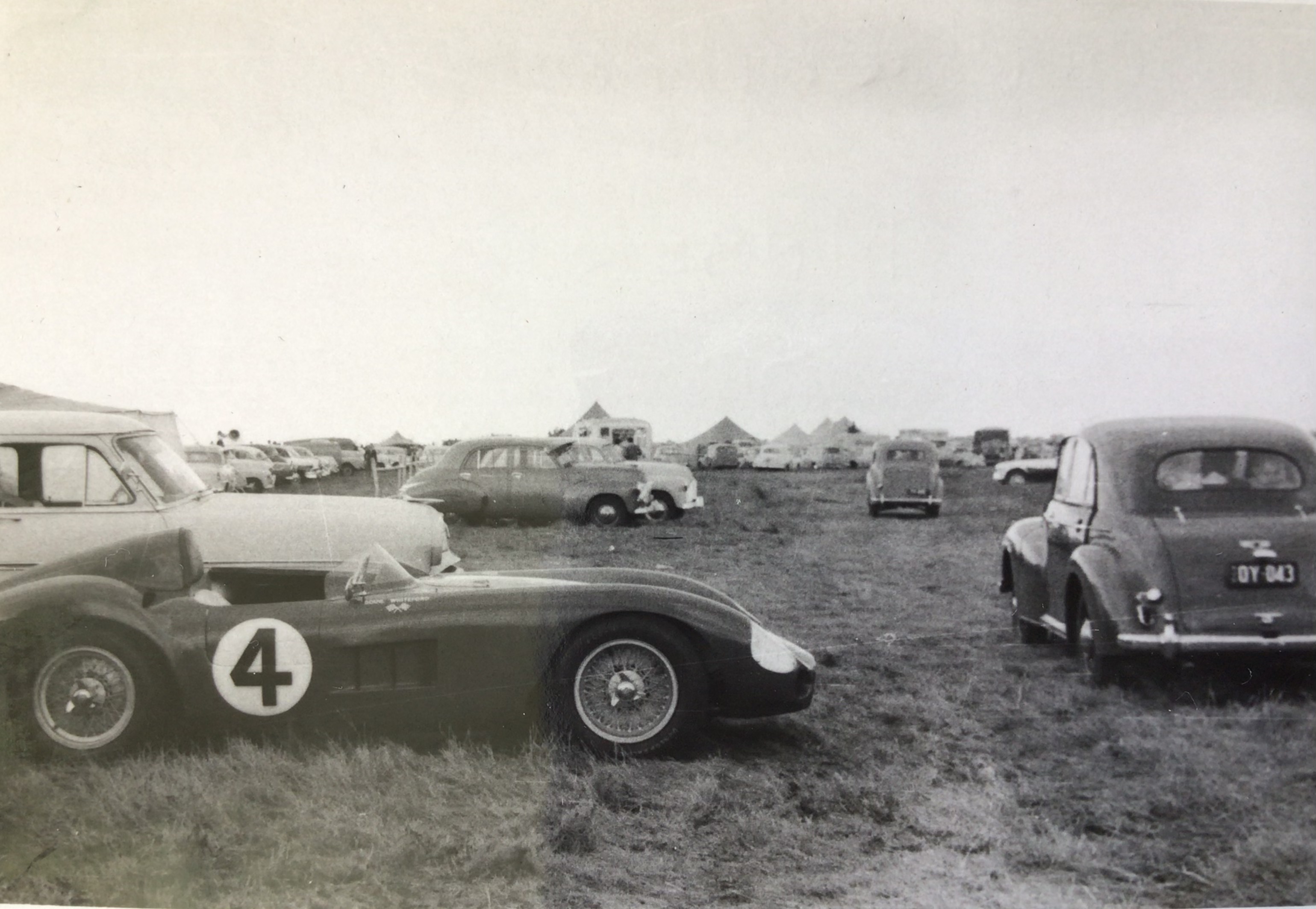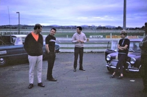 Note John Roxburgh standing at right and what looks a bit like Bib Stillwell in the cream jumper? Holden Ute and wonderful colour gives us a perspective on male fashion of the coolish day- October 1958 or February 1959 meeting.