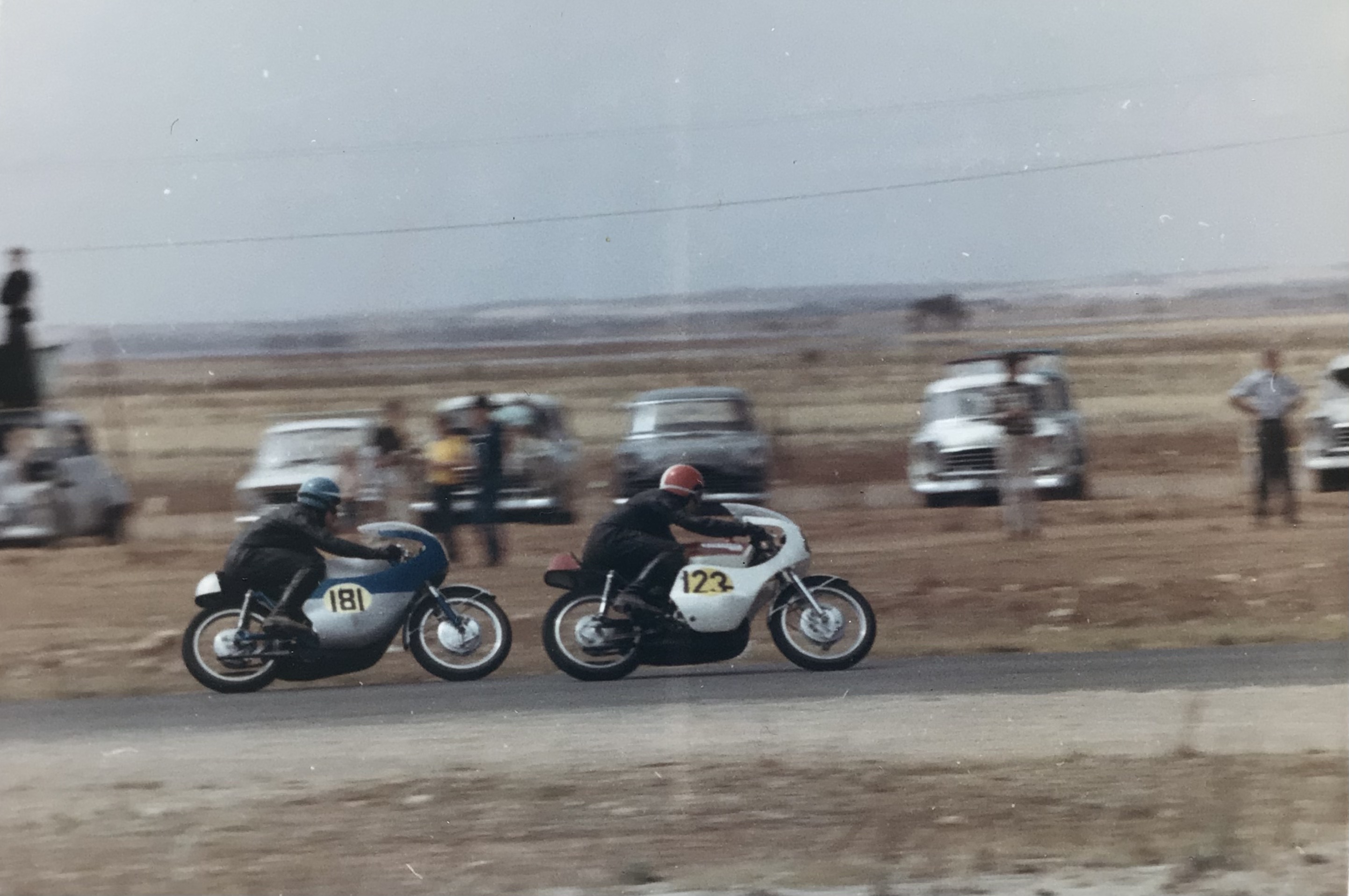 ‘The shot above is my first meeting aboard the Suzuki TR250 at Mallala in January 1966. It must be during practice as the engine mounts cracked so I didn’t start. It’s the left-hander after the hairpin, the bike in front is a Kawasaki 250 production racer.’