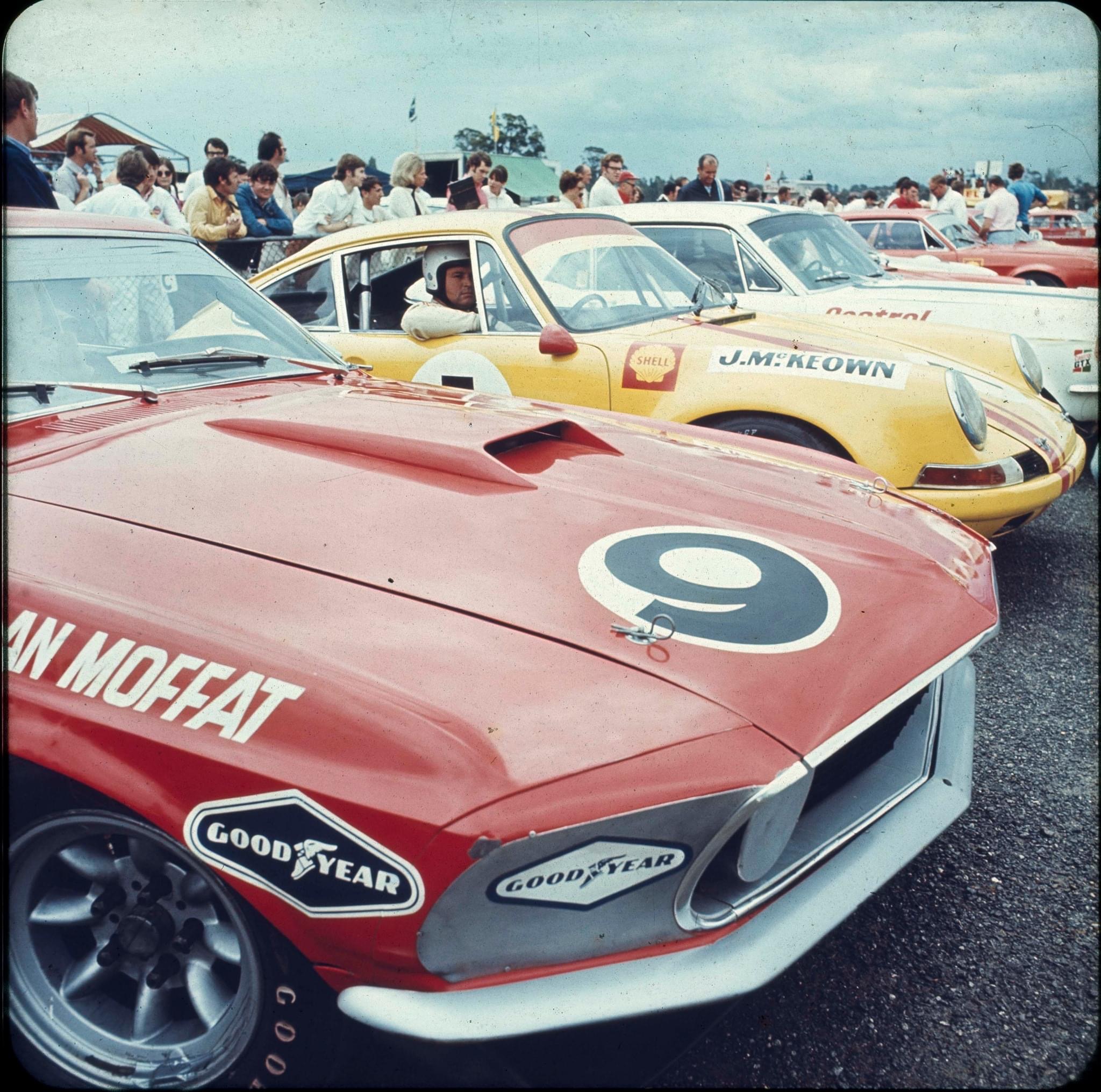 Allan Moffat, Mustang Trans-Am, Jim McKeown, 911S, Pete Geoghegan, Mustang, you can just see Brian Foley’s 911S then Bob Jane’s Mustang Shelby Trans-Am on the dummy grid.