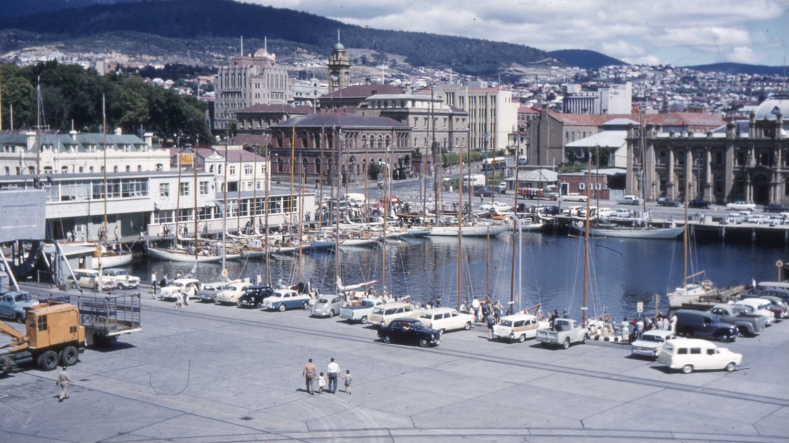 I wonder if the Salamanca stage of the trial is a speed test or speed and braking? Note all the kegs of something nice. In the fifties this stretch is now filled with lots of wonderful cars, restaurants and places of fun. It is to the left in this mid-sixties shot of Constitution Dock looking towards Hobart CBD. The boats are possibly from a not long finished Sydney-Hobart.