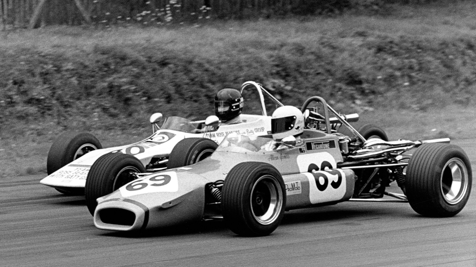 A.I.R.O. driver Alan Jones at it hammer and tongs with another up-and-comer, James Hunt at Brands Hatch during 1971. Brabham BT28 and March 713M.
