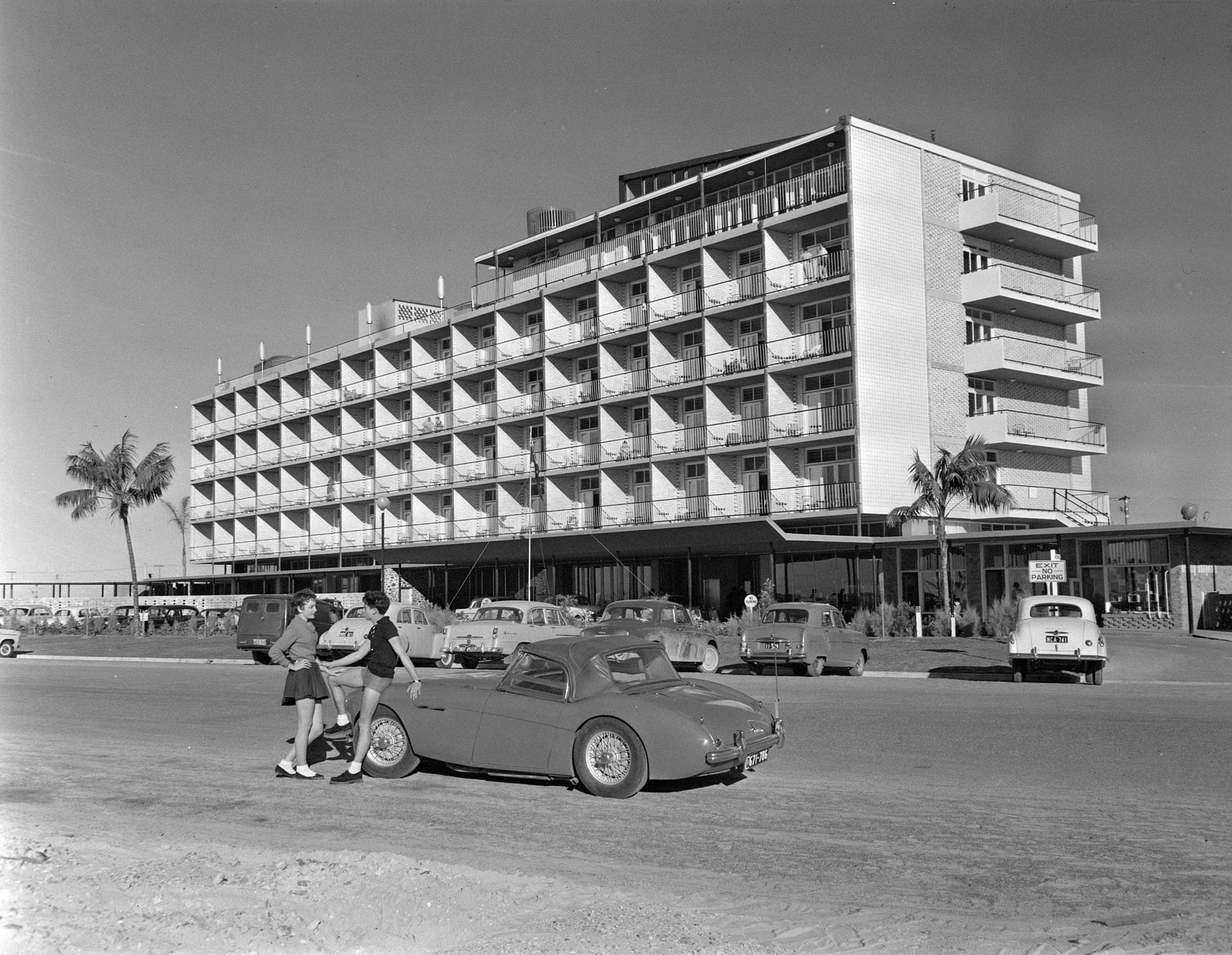 Leggy-lass, as we say in polite society, and a chap with quite questionable clothing taste, and Austin Healey 100 outside the Broadbeach Hotel on Queensland’s Gold Coast in 1957.