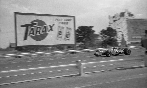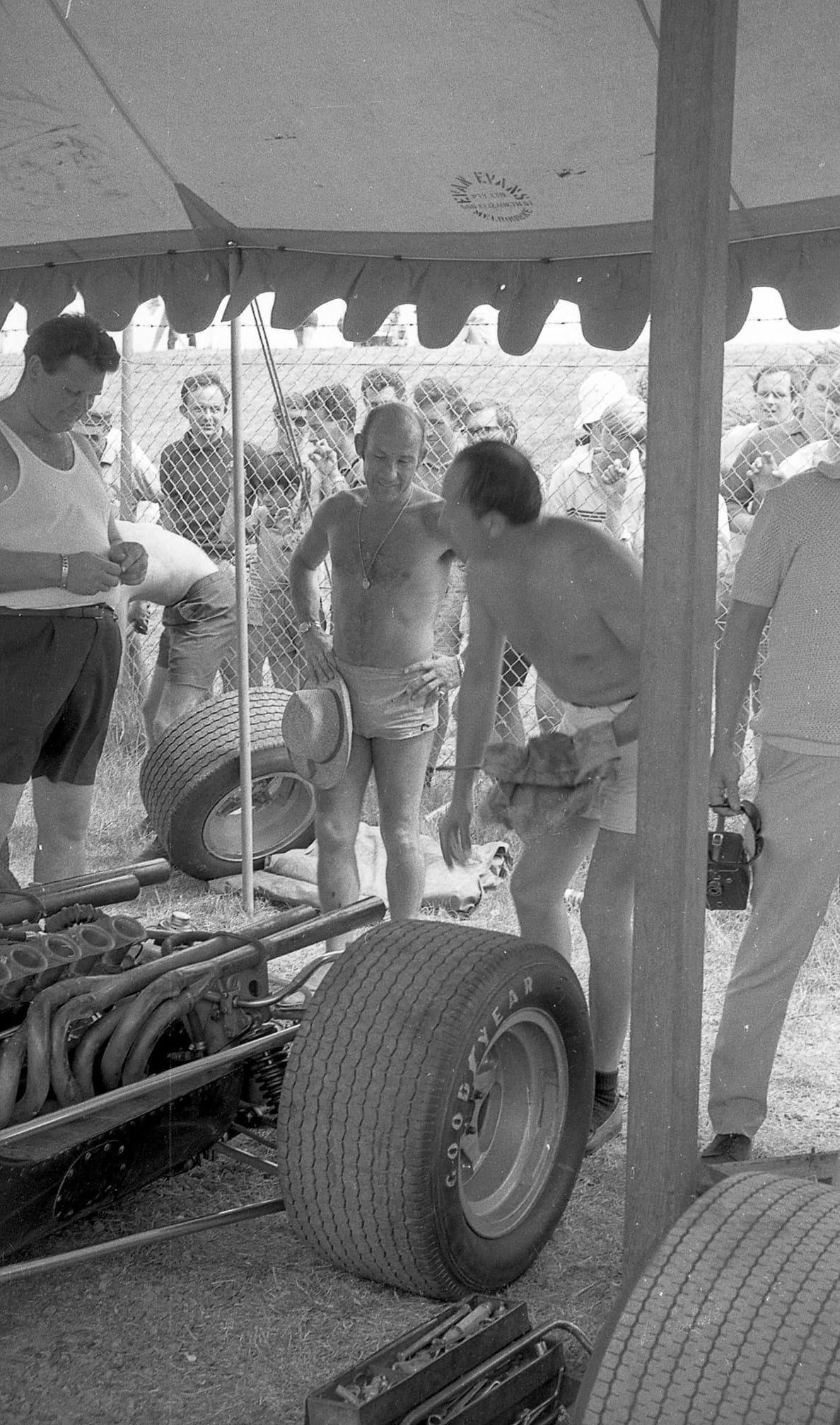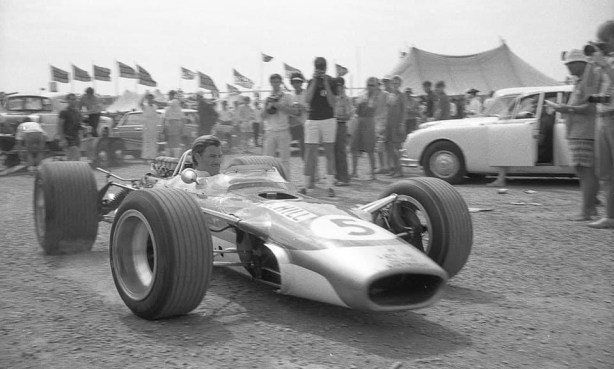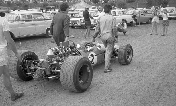 Can ‘yer grab my helmet Alec- I gotta go. Kevin Bartlett talks to his headless team-chief at Wigram in 1968, it was the first Tasman Cup KB did in full, both Kiwi and Oz races.