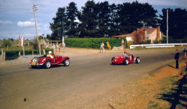 The first shot shows John French’ Holden 48-215 at the far left, then the white RAWGS sportscar , the beautiful blue JWF Milano and the Barnes MG TC Spl at far right- thanks to Dick Willis for the IDs. The photographs below are from the carpark looking back up the hill.