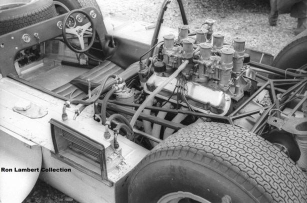 Here is the car John Goss raced at Oran Park in the hands of its creator Frank Matich at Sandown Park during the February Tasman Cup meeting. Repco’s Ken Symes and Matich’ chief mechanic Derek Kneller pushing.