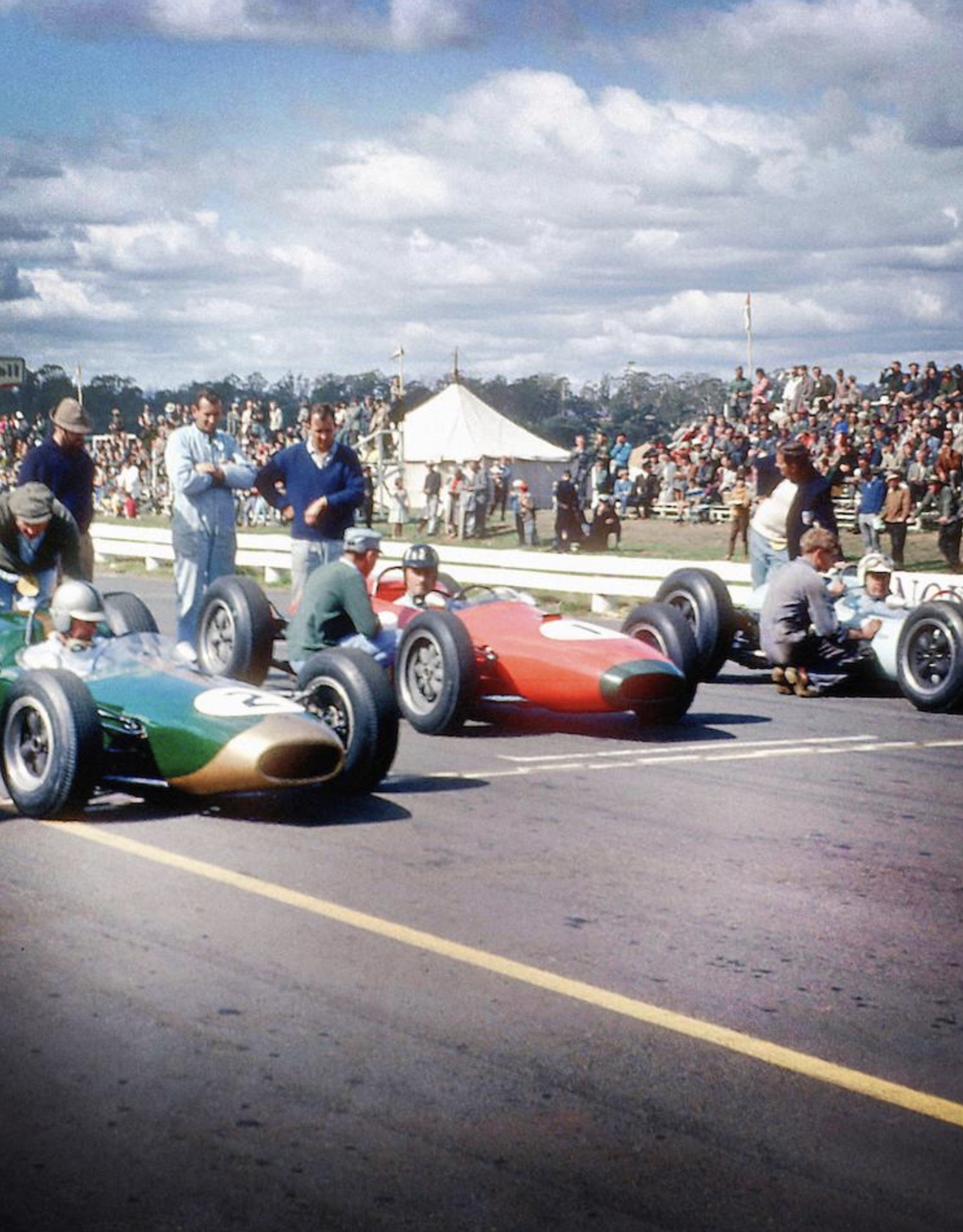 The boss awaits his driver- David McKay at far right in the Warwick Farm dummy grid area during the 1964 Warwick Farm 100 meeting. Jack Brabham (I think) offers advice.