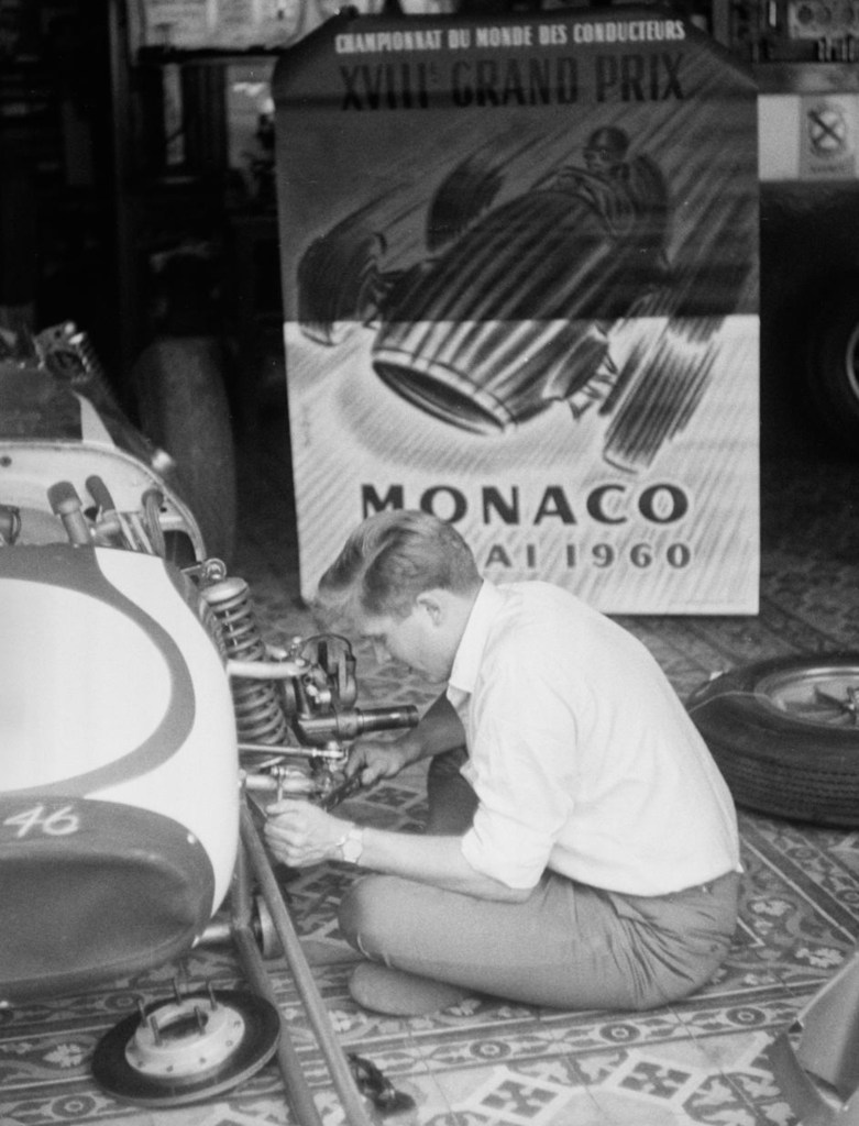 Lance Reventlow front and centre with foot on the tyre. Scarab, Monaco 1960