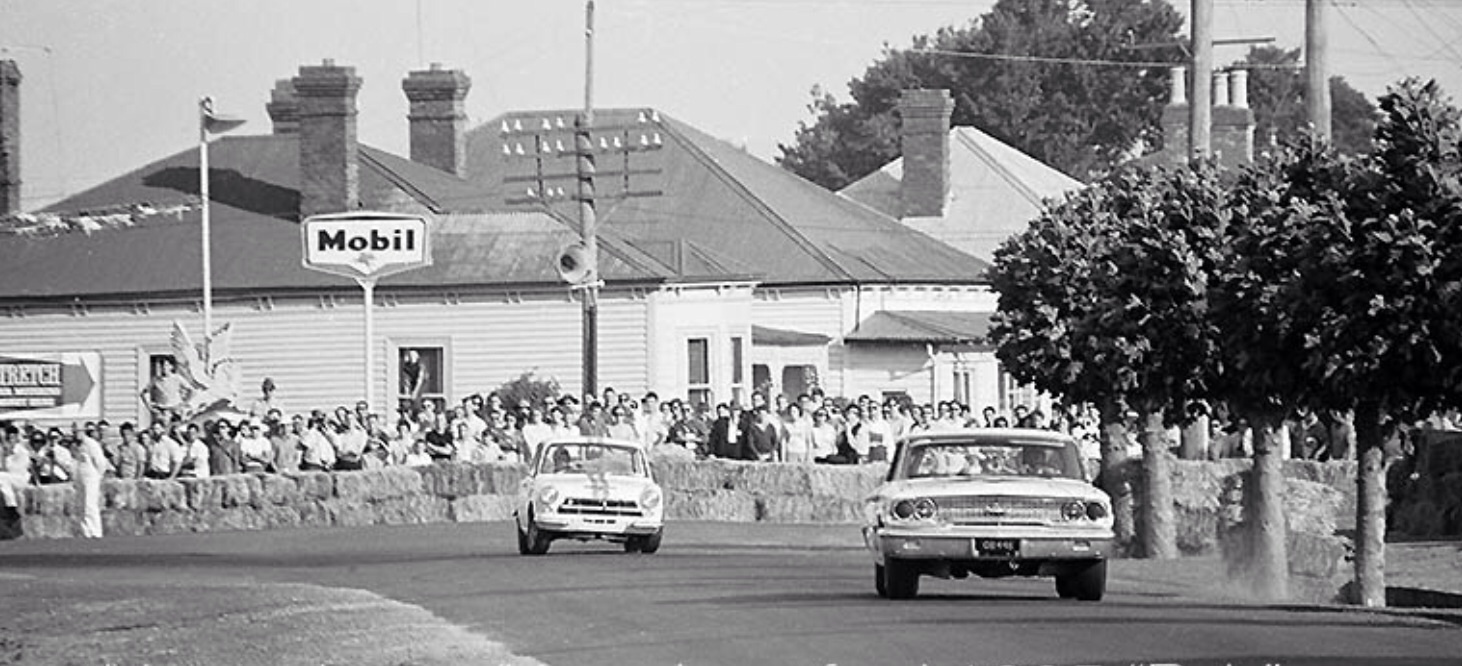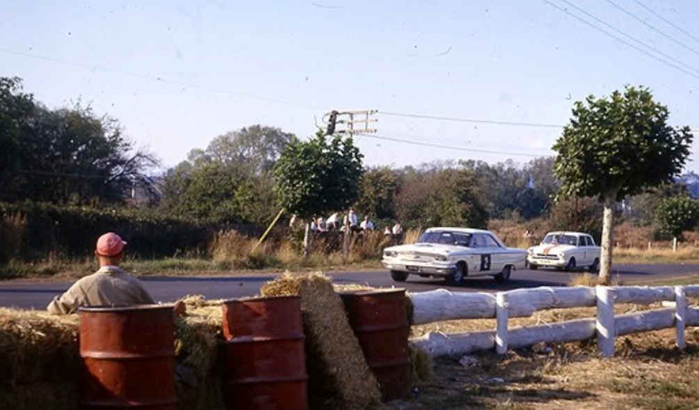 Sir Gawaine Baillie’s Ford Galaxie leads Bob Jane’s Lotus Cortina at ‘Pub Corner’, Longford in March 1965…
