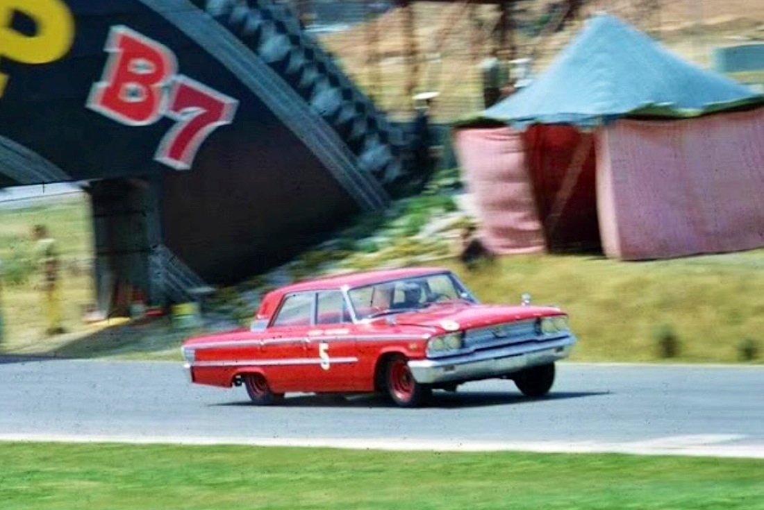 Gavin Fry’s shot of the Baillie Galaxie at Sandown in November 1964 shows the lines of the handsome big car to good effect. Note heavy steel wheels, brake duct and vestigial roll bar (G Fry)