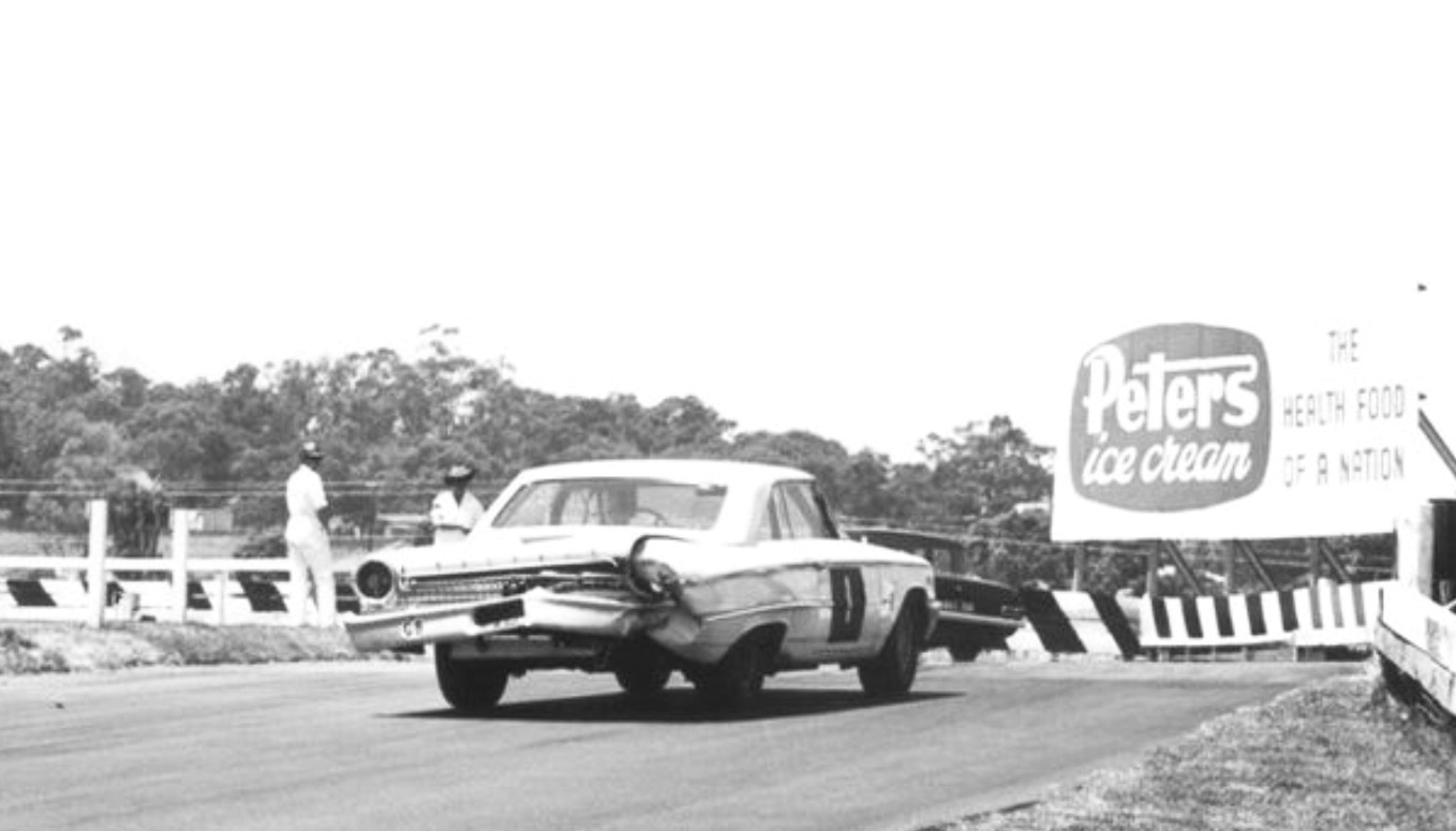 By lap 40 Lex had a three lap lead over Moffat’s second placed Lotus Cortina – at that stage he needed six-pumps of the brakes to get a useful pedal. Then, as he started his 47th lap he could get no pedal on the 170 kmh run along Pit Straight before the second gear, slow Peters left hander. “I managed to change down to second, then to first, and tried to spin the big car in this very tight corner. I managed to pull off this manoeuvre once before when driving Len Lukey’s car, but this time I did not manage it quite so cleanly and the tail whacked the fence.”