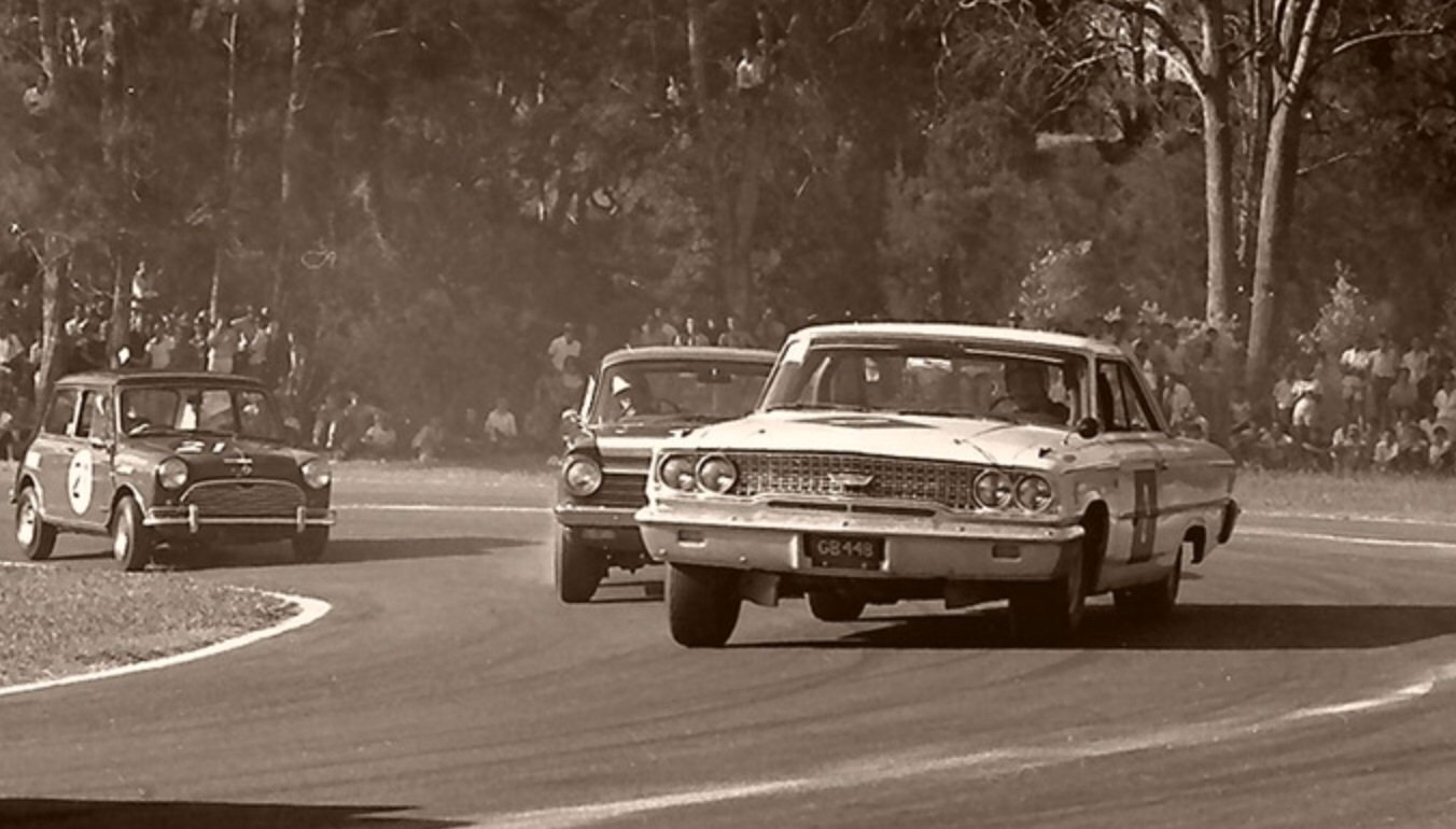 Allan Moffat’s Grp 2 Lotus Cortina, just acquired from Team Lotus – of which he had been a member – arrived from the US after practice had finished, while Bob Jane’s Grp 1 Lotus Cortina three-wheeled around in characteristic style in 1:30.1. During practice the Galaxie’s wheels and tyres arrived air freight from the UK- so, all was prepared with the Galaxie demonstrably the fastest car on the circuit.