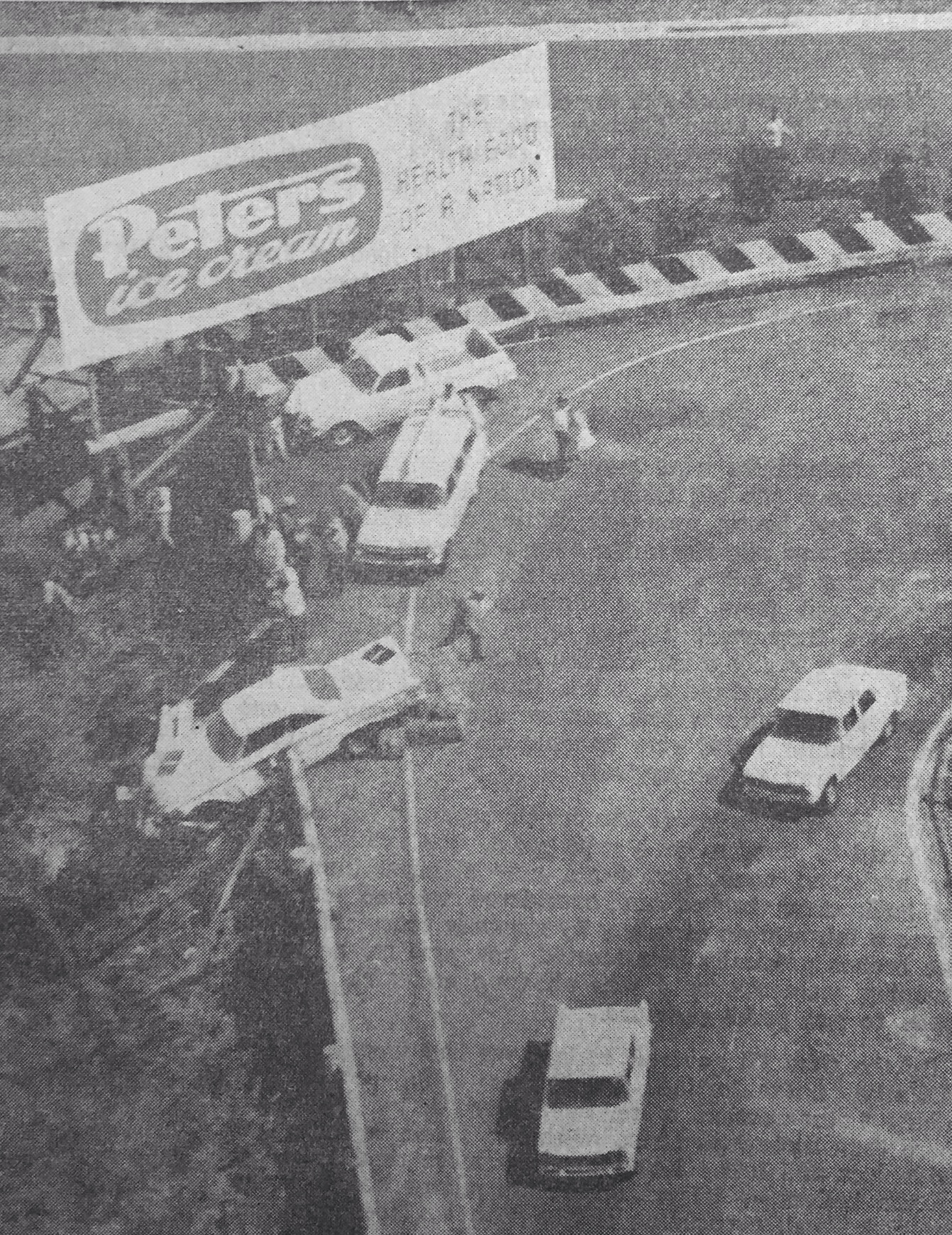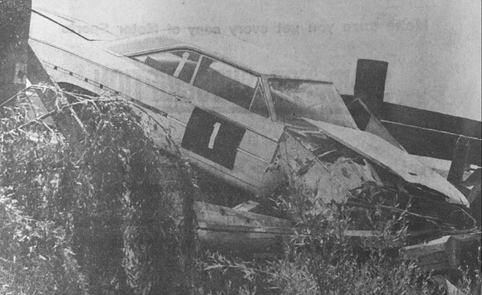 The Galaxie, brakeless and in neutral at about 120 kmh smote the timbers head on an amazing impact, smashing through the planks with all the physics of a 1600kg car. He displaced a 12 inch diameter fence post which drove the right front wheel back against the firewall. “The car stopped halfway through the fence, nose down on the edge of the 20 foot drop into the reservoir, only escaping the fall because the front of the car was resting on the hefty fence post.” Lex’s door was jammed, the right hand door was locked but eventually he got out, severely shaken but otherwise amazingly ok.