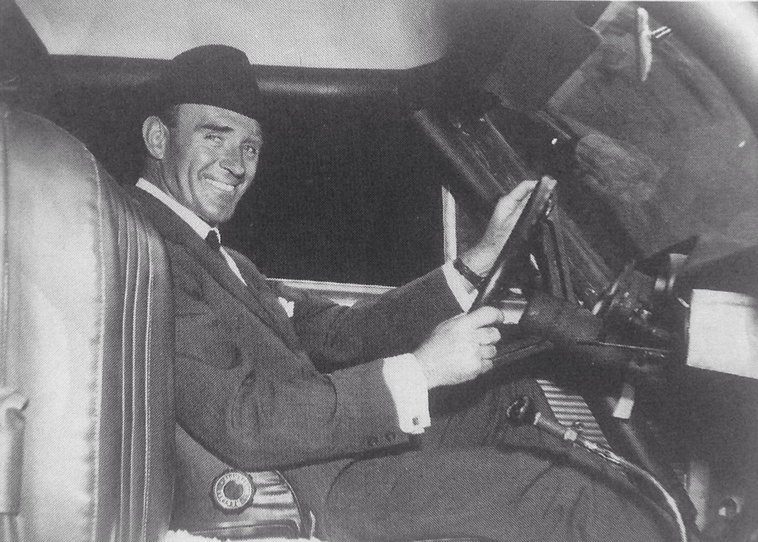 Davison with suit, tie and hat about to have some fun! A road trip in his racer from Port Melbourne to Armadale, 10 km or so on built up inner urban Melbourne roads (Davison)