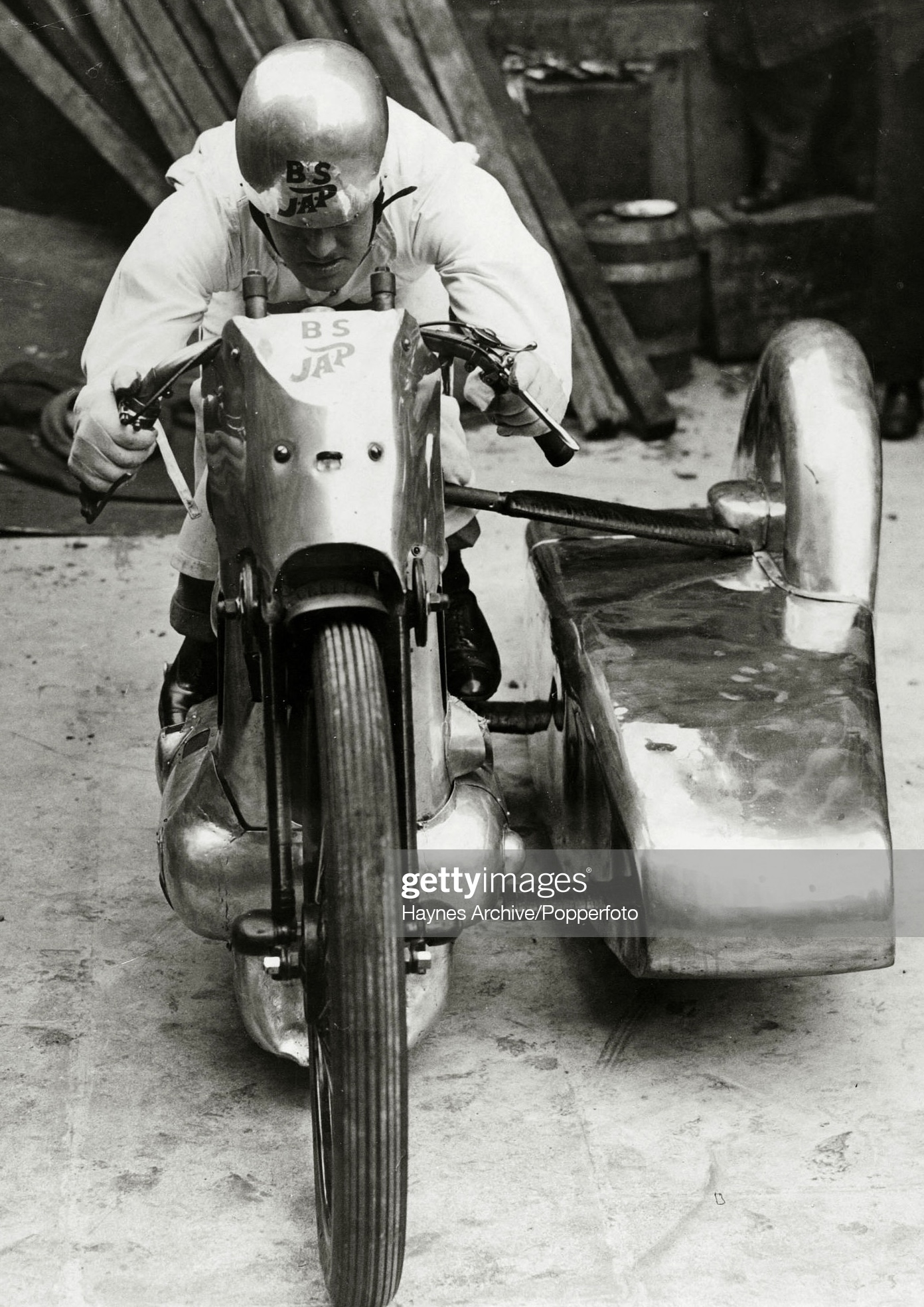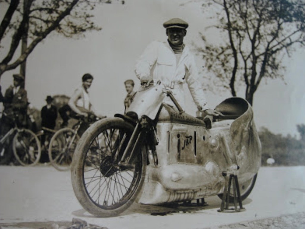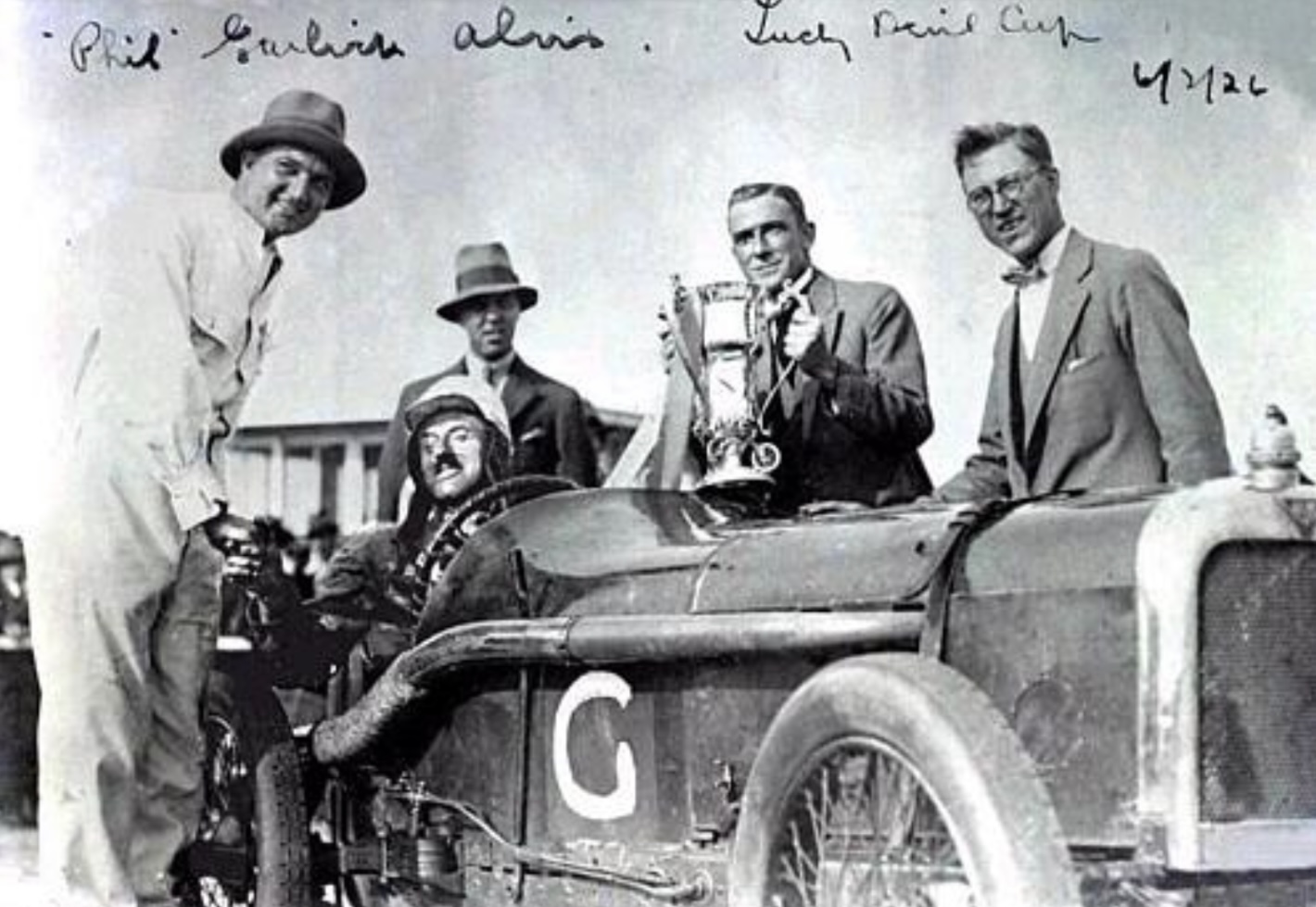 Davison with suit, tie and hat about to have some fun! A road trip in his racer from Port Melbourne to Armadale, 10 km or so on built up inner urban Melbourne roads (Davison)